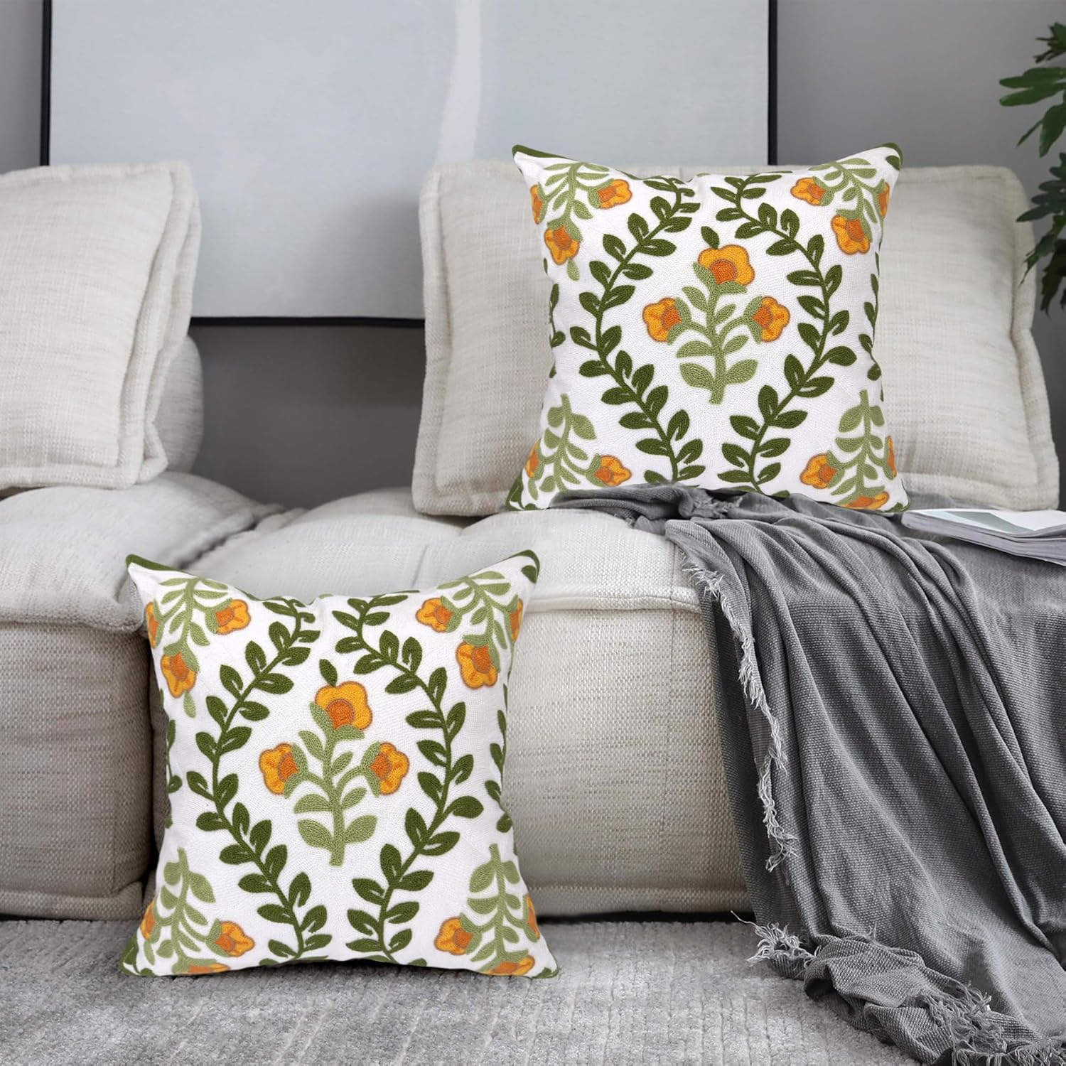 Alysheer Floral Embroidered Summer Decorative Throw Pillow Covers 18"x 18" Set of 2, Farmhouse Cottage Orange Flowers Green Leaves Knit Patterned Cotton Canvas Cushion Case for Couch Bed Living Room