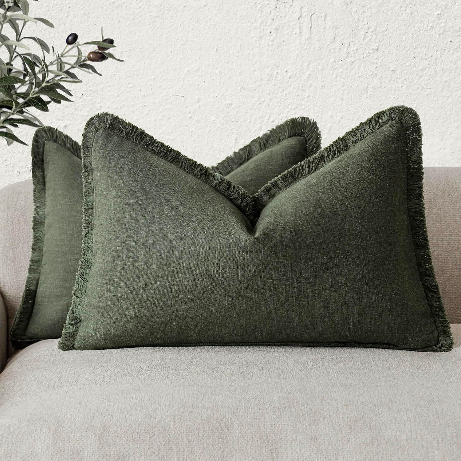 Foindtower Set of 2 Decorative Linen Fringe Lumbar Throw Pillow Covers Boho Farmhouse Cushion Cover with Tassels Accent Pillowcase for Couch Sofa Bed Living Room Home Decor,12×20 Inch,Dark Olive Green