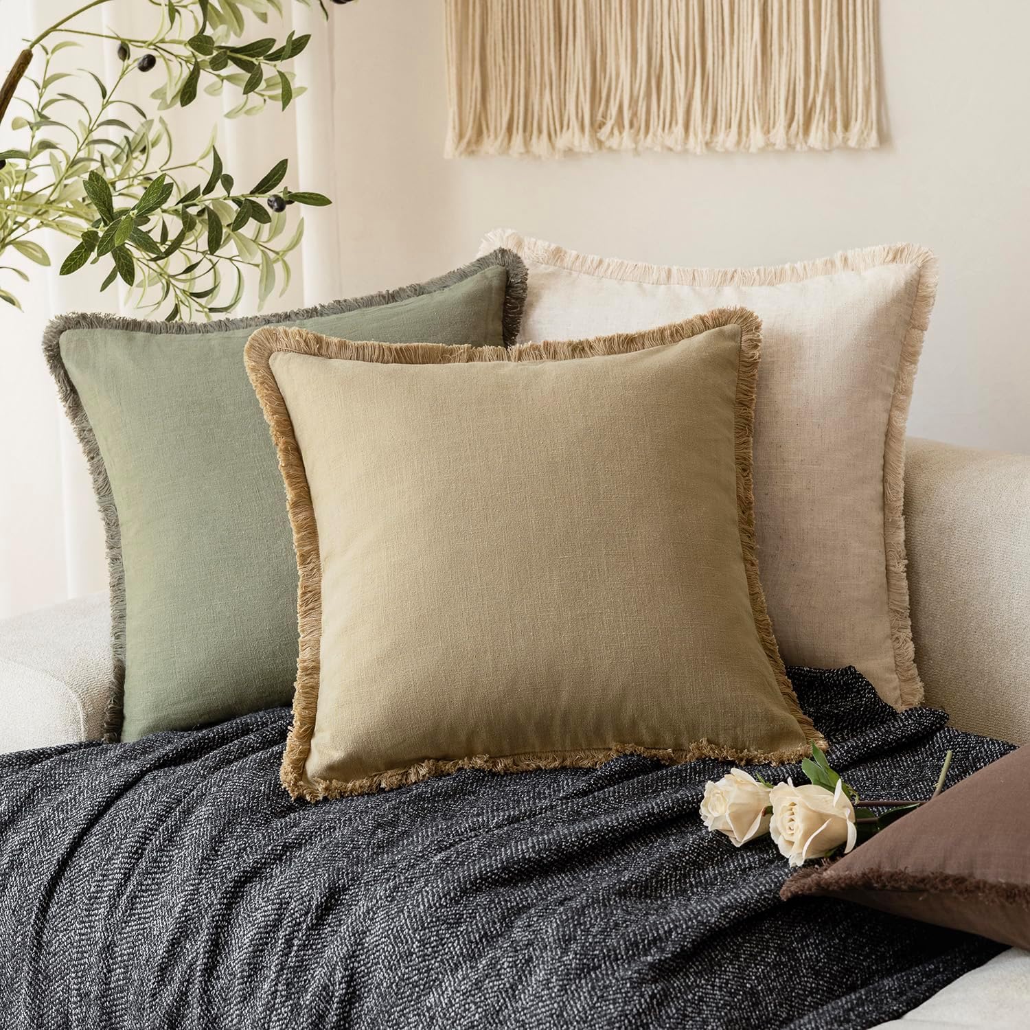 Foindtower Set of 2 Decorative Linen Fringe Throw Pillow Covers Farmhouse Cushion Cover with Tassels Soft Accent Pillowcase for Couch Chair Sofa Bed Living Room Home Decor,22×22 Inch,Light Khaki Taupe