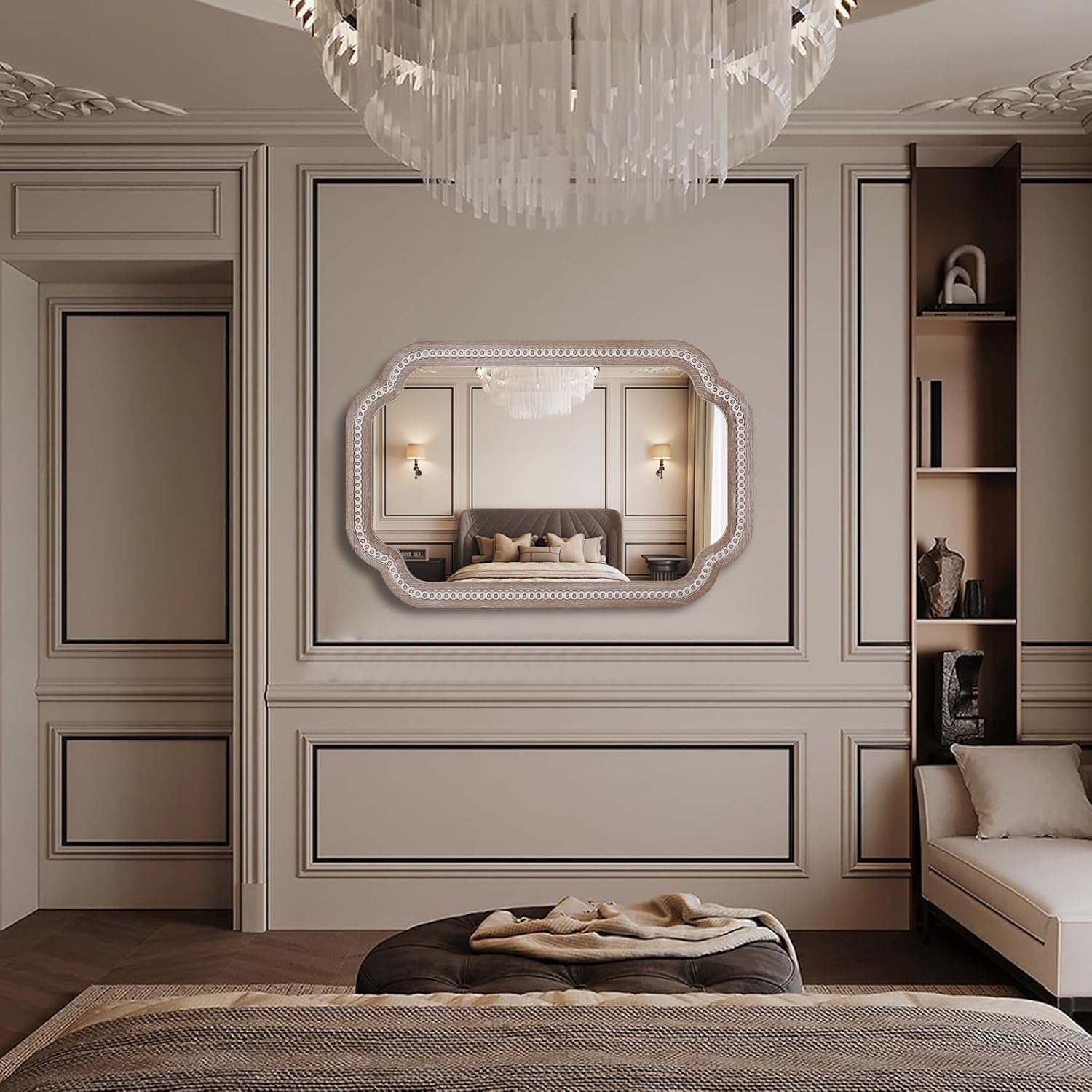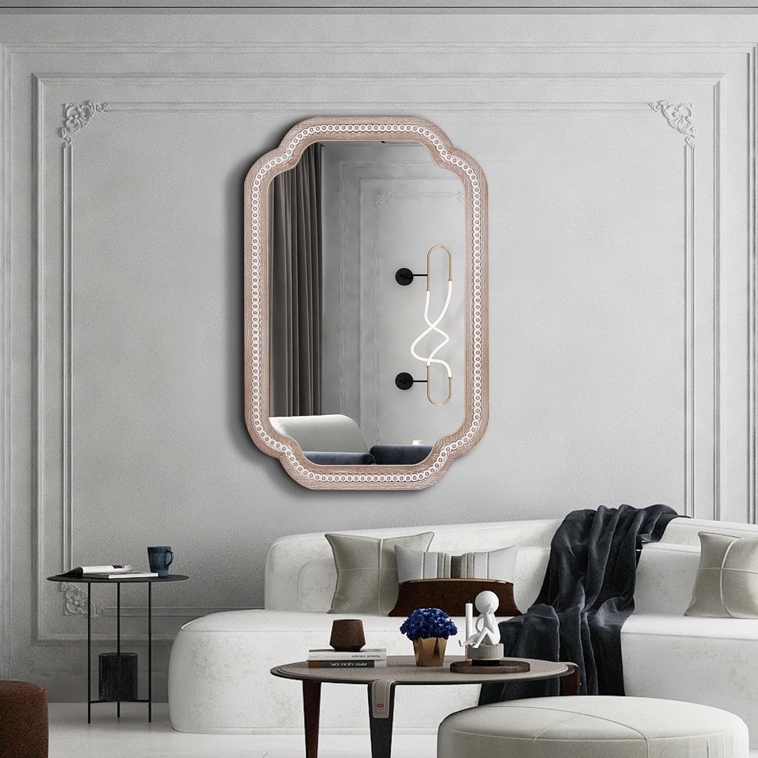 - Unmatched Elegance: Elevate your space with our exquisite bathroom mirror Scalloped wood frame, a stunning 36x24 inches in size. Imagine it gracing your entryway, reflecting natural light and welcoming guests with its unique design.