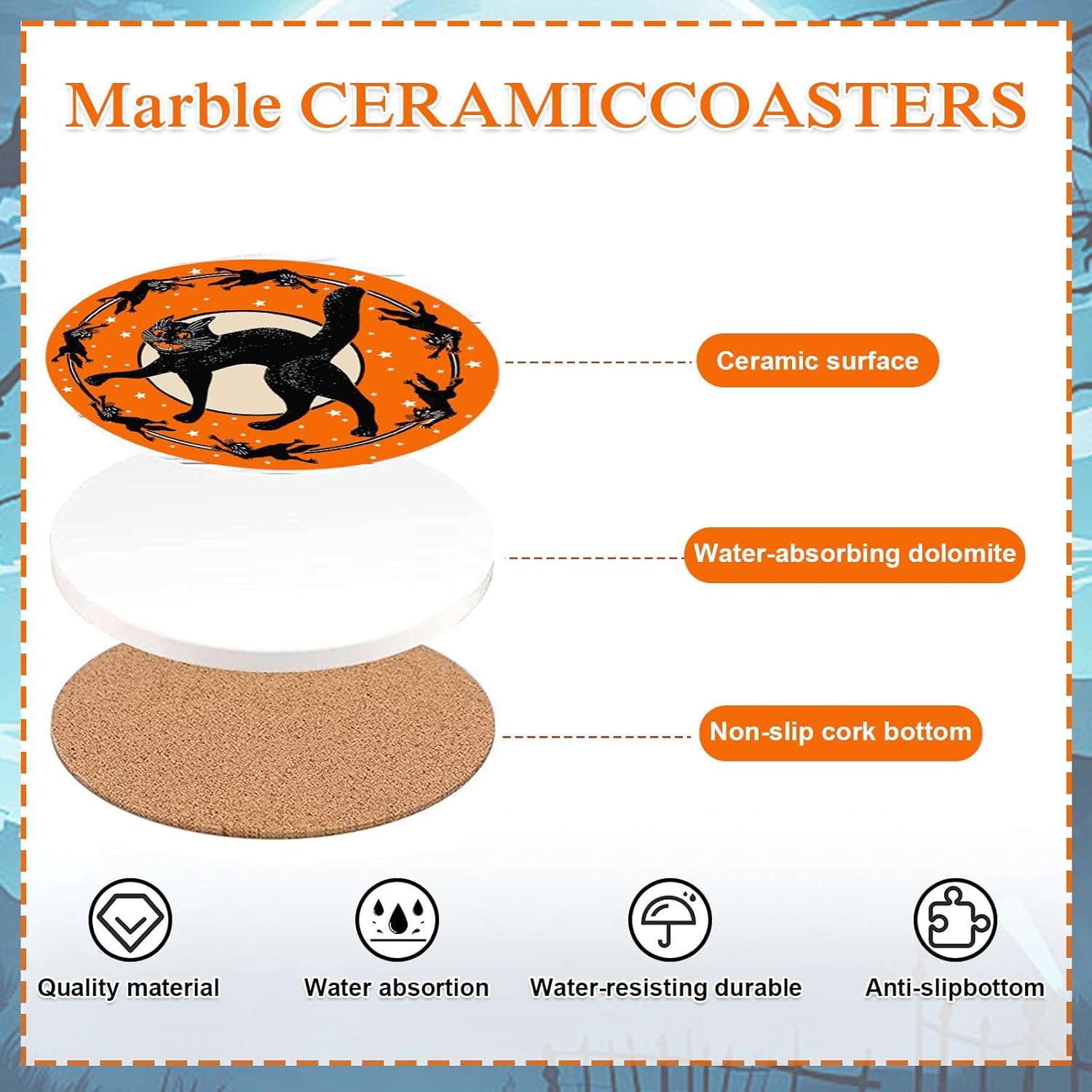- DELICATE DESIGN: Our coasters are Halloween themed, taking orange as the background color, patterned with black cats, vintage and eye-catching, which will be the perfect complement to your Halloween and everyday table decor.