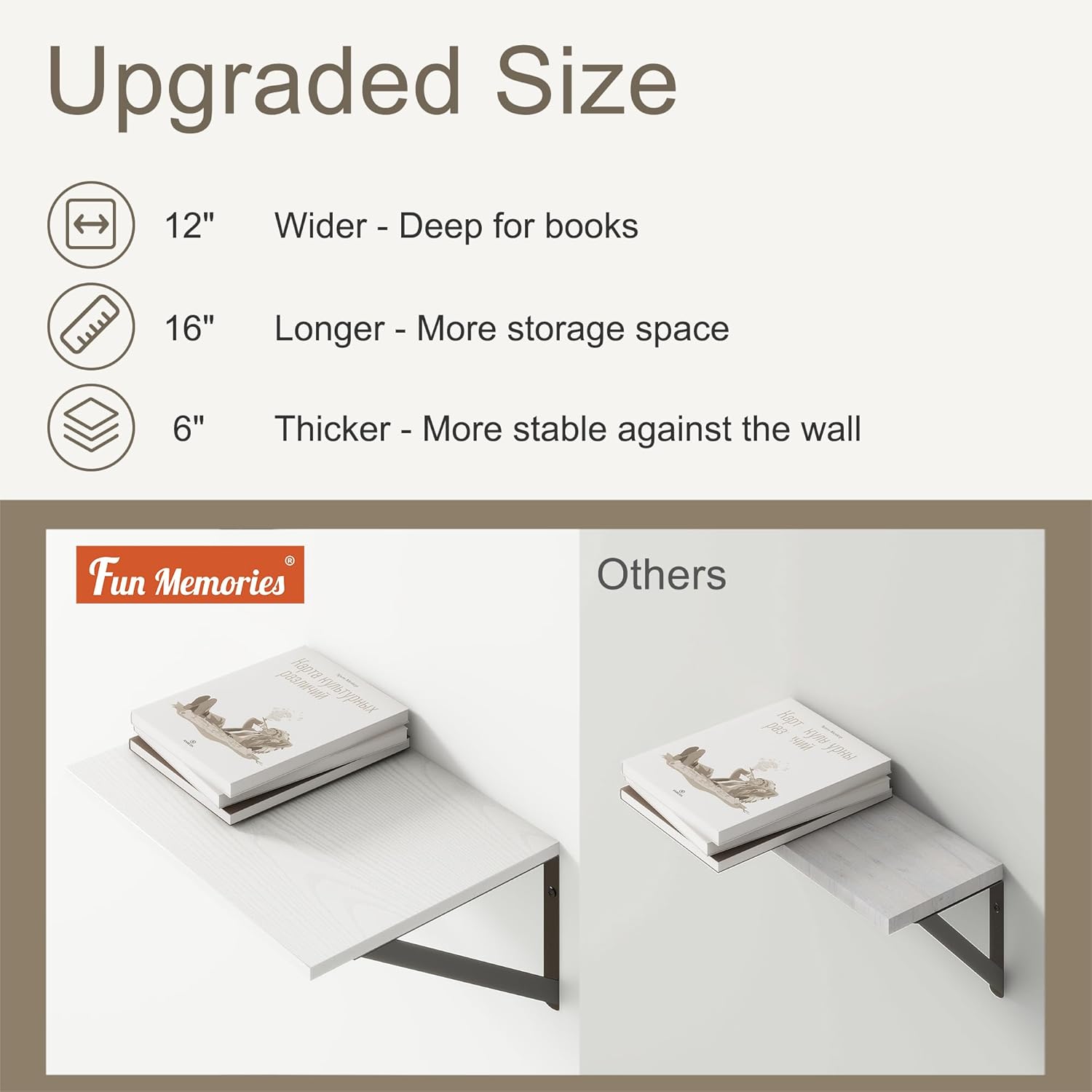 Fun Memories Floating Shelves Set of 2, 16" W x 12" D, White Ledges for Bedroom, Bathroom, 12" Deep Bookshelf Wall Mounted