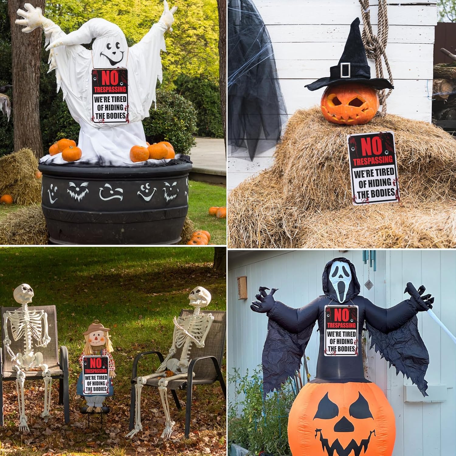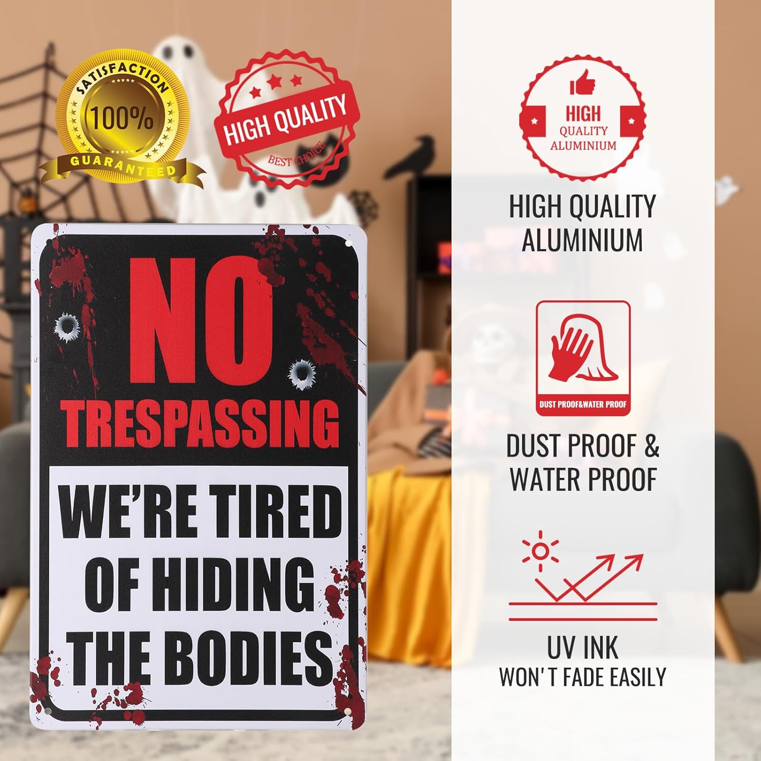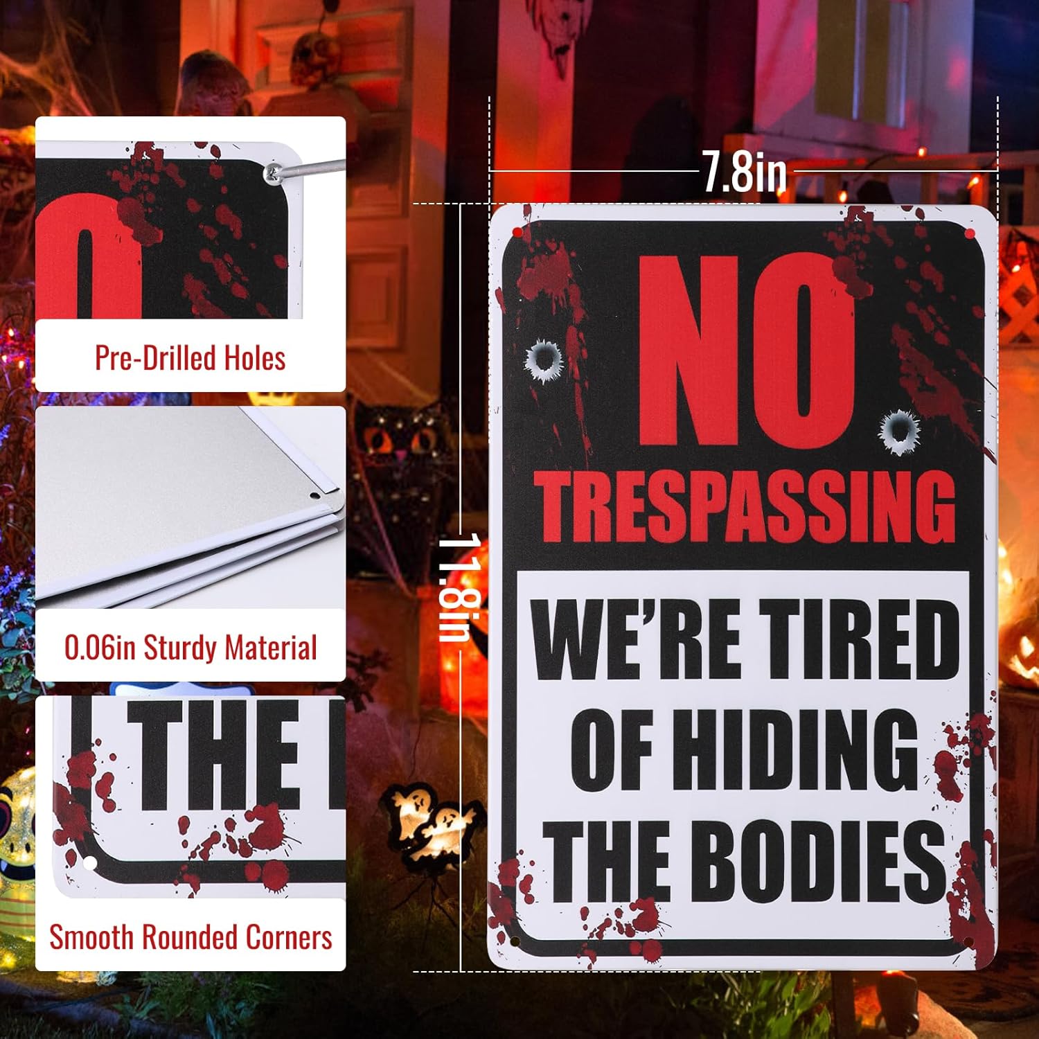 - High Quality: No trespassing signs funny feature durable rust free aluminum; waterproof dust proof and fade resistant UV printing; suitable for indoor and outdoor Halloween home decor