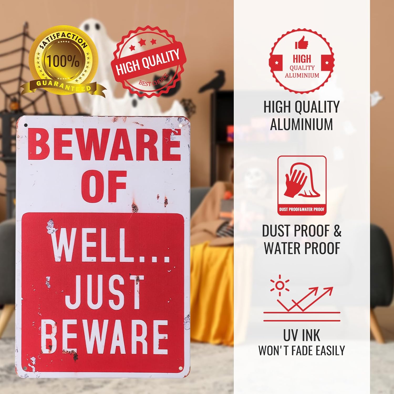 - High Quality: "Beware of Well Just Beware" sign made of durable rust free aluminum. Features waterproof, dustproof construction and fade-resistant UV printing;suitable for indoor and outdoor Halloween home decor