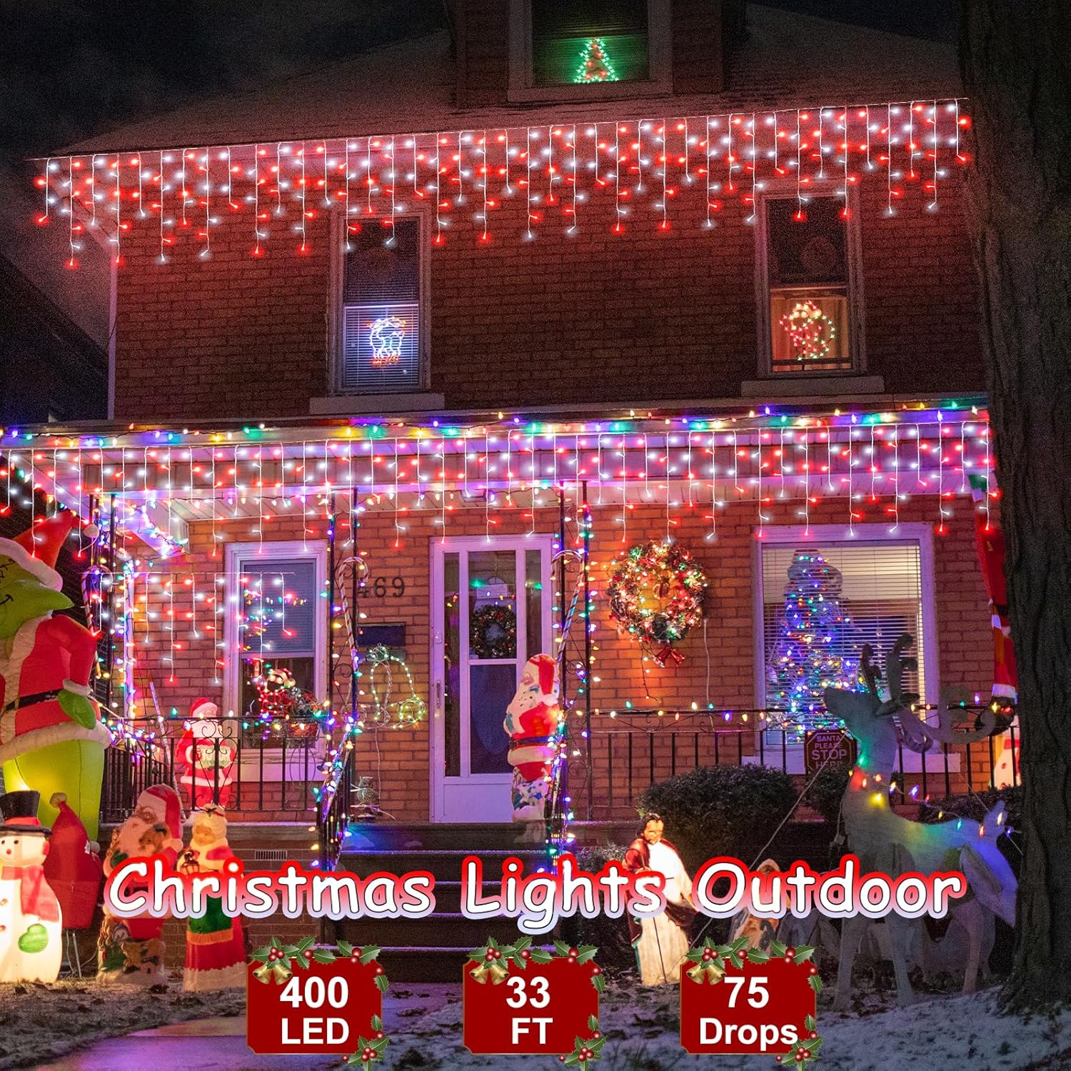 - Connectable Outside Christmas Lights: 400 pieces LED bulbs 32.8ft light length, each icicle light has end-to-end connection that allows up to 3 light strings connected together to meet your different decor needs. 9.84ft lead wire meant no need an extension cord, perfect twinkle lights for outdoor decoration.