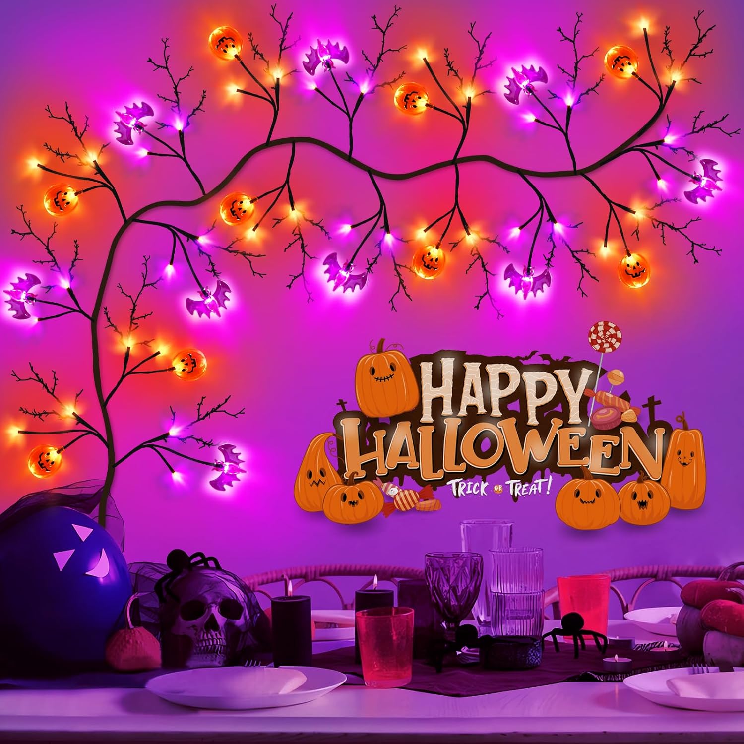 7 Ft 63 LED Halloween Willow Vine Twig Garland with 8 Modes Timer Orange Purple 21 Pumpkin Bats Lights,Halloween Garland with Waterproof Battery Operated for Indoor Wall Fireplace Decorations
