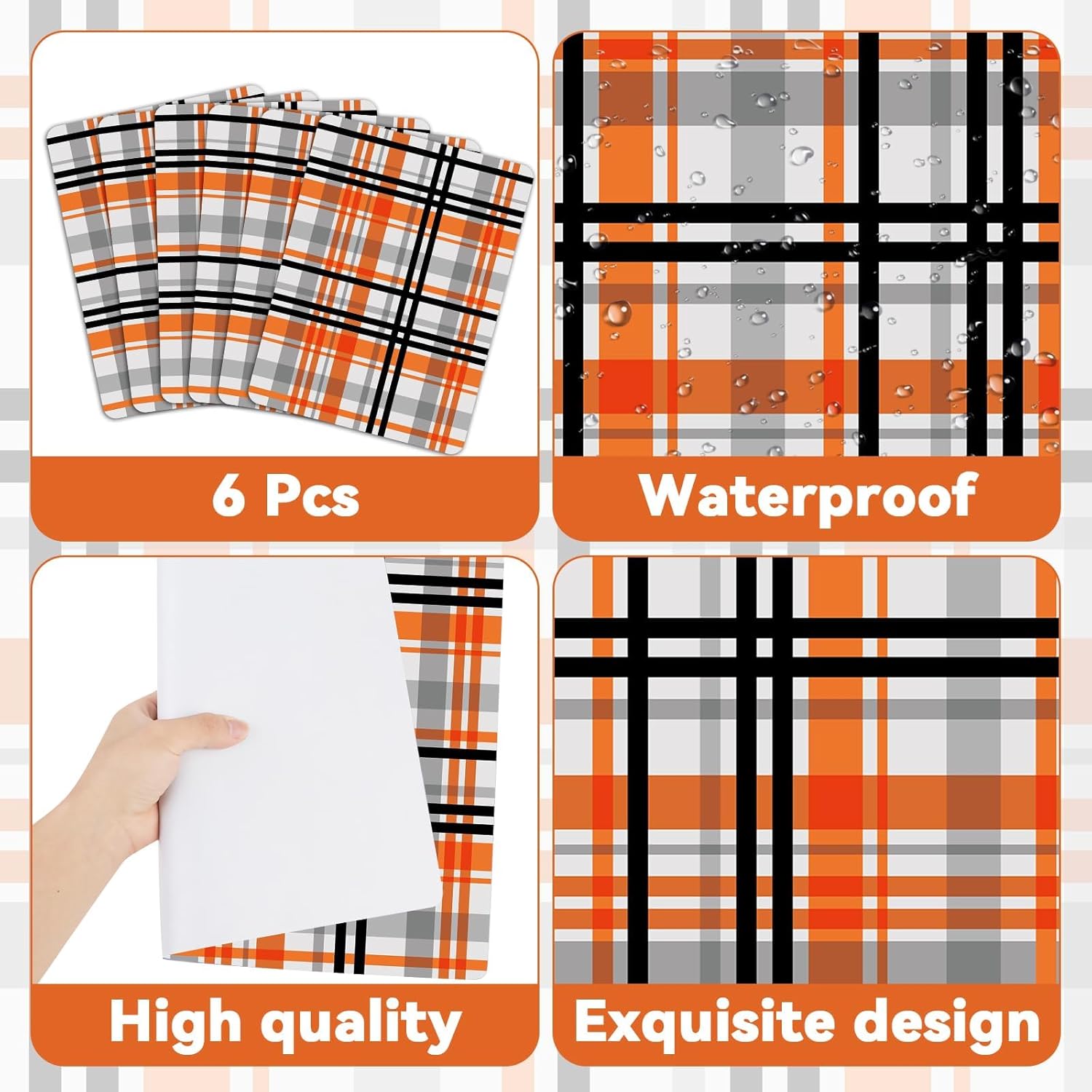 - Package includes:This set includes 6 pieces halloween orange black buffalo plaid placemats, offering a generous quantity to easily accommodate your family and guests.Orange black placemats provide ample coverage for your dining table; keeps your tableware stay protected from spills and stains, allowing you to focus on creating cherished memories with your loved ones.