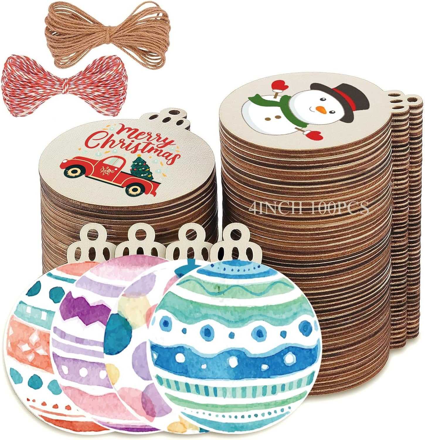 4" 100PCS Christmas Wooden Ornaments Unfinished, DIY Christmas Crafts for Kids Wood Slices DIY Crafts Supplies for Girls Adults, Christmas Ornaments Holiday Decoration