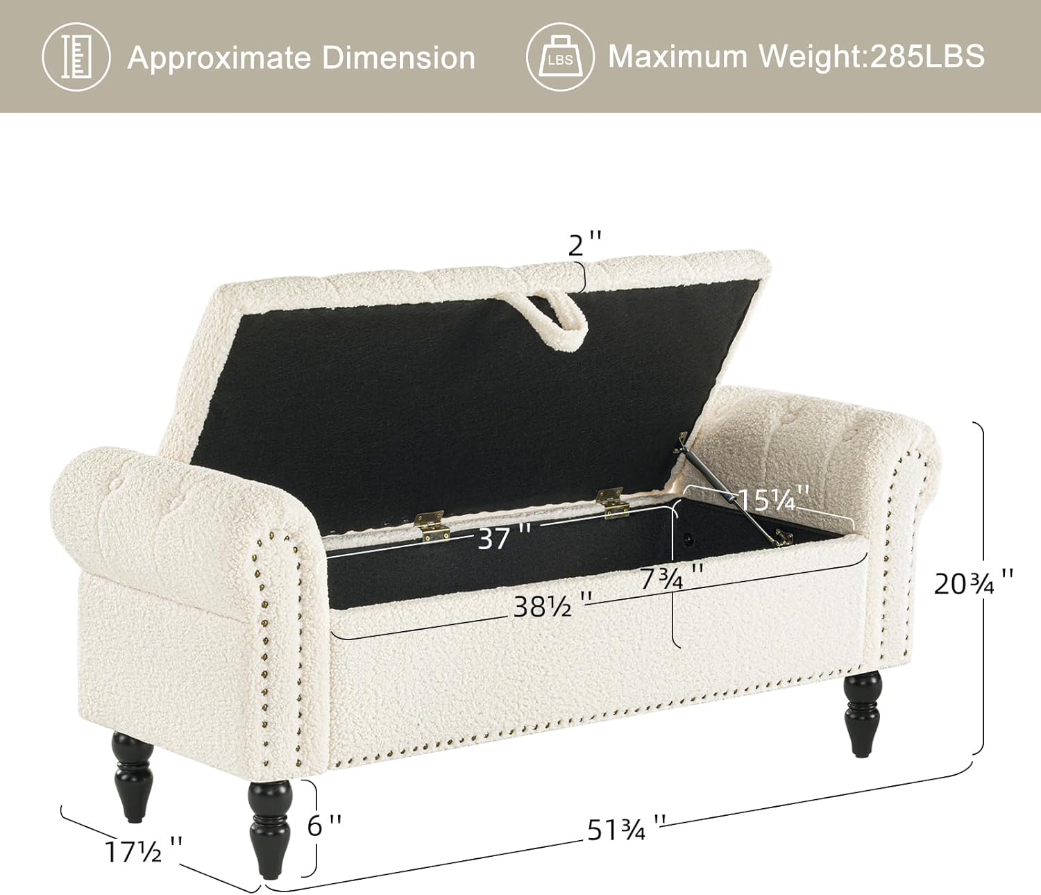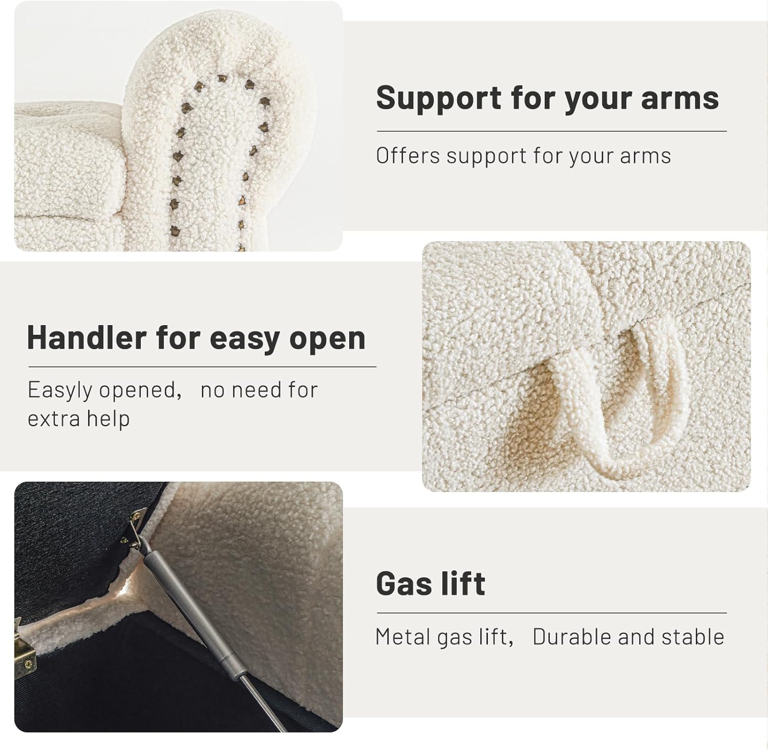 Furniliving Modern Storage Ottoman Bench, Sherpa Ottoman End of Bed Bench with Solid Wood Legs Upholstered Ottoman Benches with Storage Indoor Bench for Living Room with Rolled Arm, Entryway, White