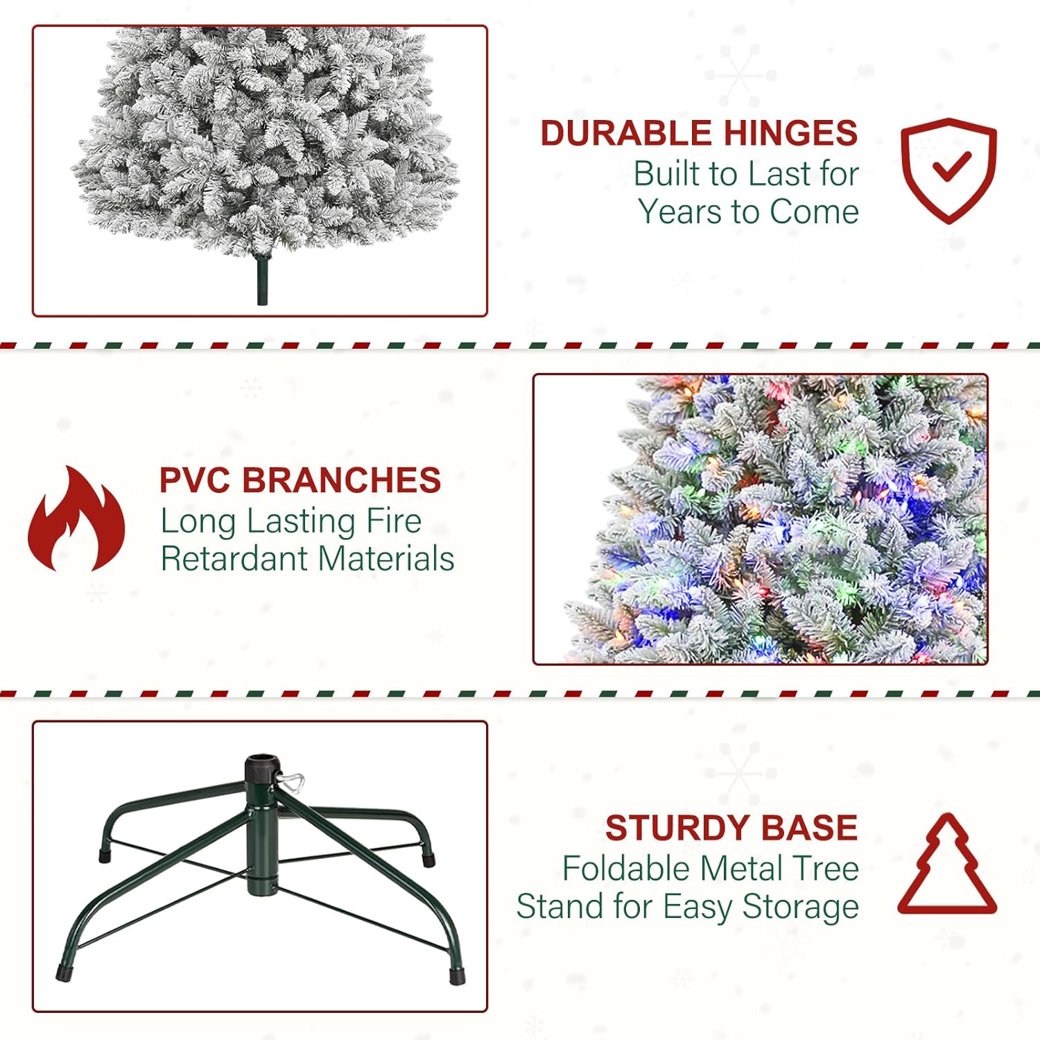 6ft Lighted Artificial Christmas Tree, 250 Multicolor LED Lights, Snow Flocked Christmas Tree with 1032 PVC Tips, Metal Base & Hinged Branches for Holiday, 10 Modes