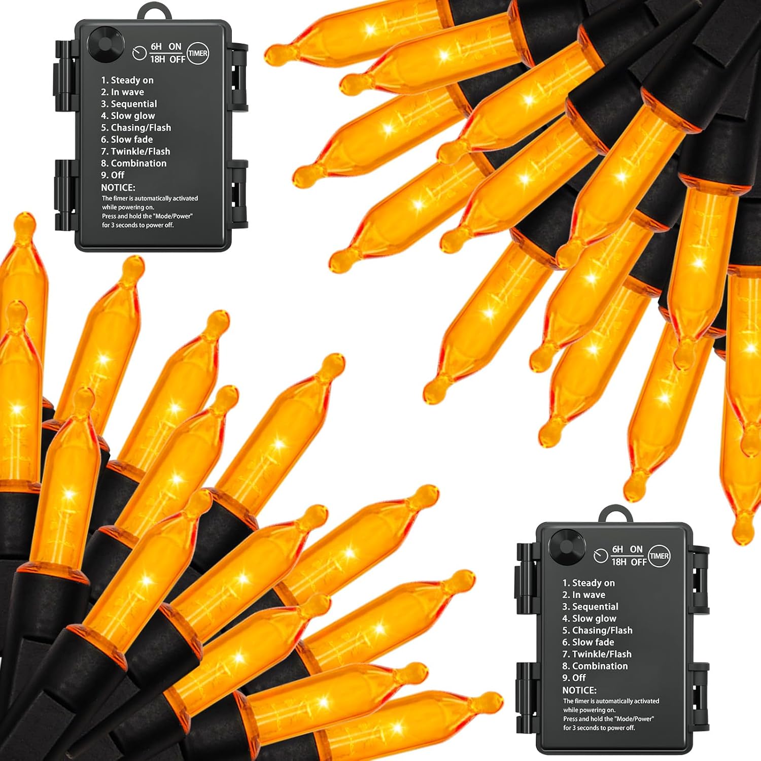- ă8 Lighting Modes with Timer ă These Orange Halloween Lights feature fantastic lighting effects with 8 Spooky Lighting Modes and press and hold the mode & power for 3 seconds to power off. Easily switch between Combination, In Waves, Sequential, Slow Glow, Chasing/Flash, Slow Fade, Twinkle/Flash, and Steady On, using the button on the battery case. Automatically controls a 6-hour on/18-hour off timer.