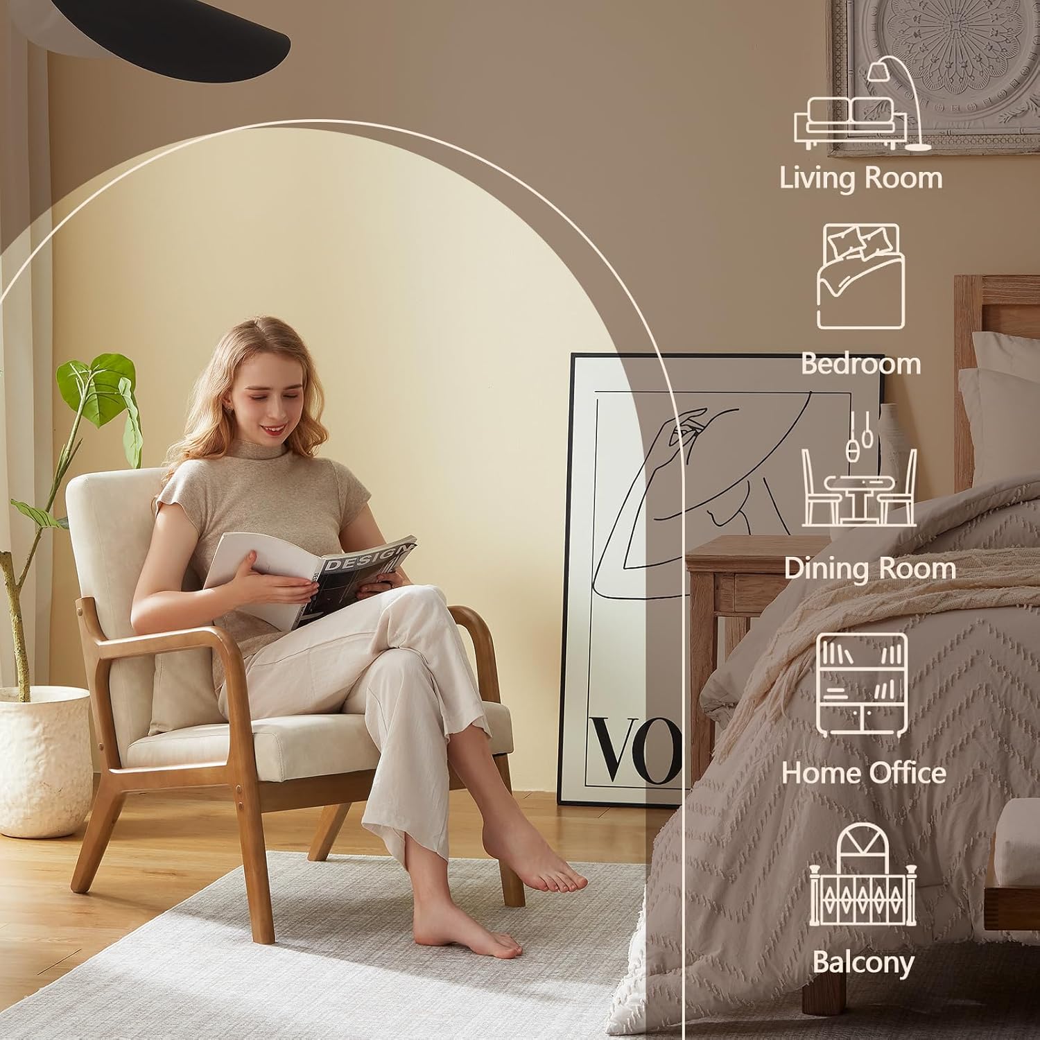 - Use scenarios: The modern armchair can be placed in the living room, bedroom, home office, dining area or even on the balcony, blending perfectly into various spaces. It's a leisure sofa that provides a more comfortable place to watch videos, play games, read books, or just relax and unwind