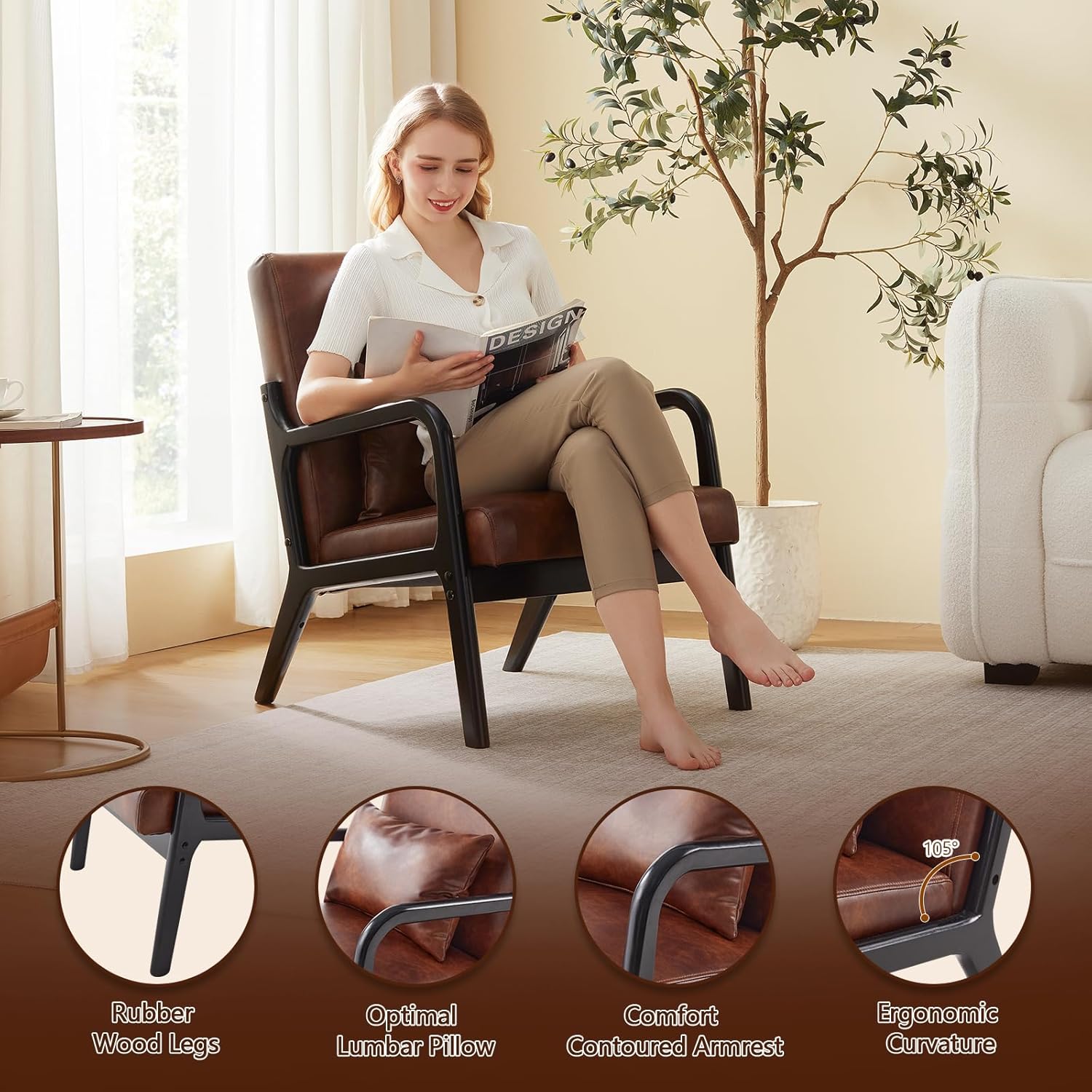 - Mid-century Modern Style:The Mid Century Modern Chair combines durability with ultimate comfort, making it the perfect addition to any room. Wrapped in water-resistant PU leather and supported by sturdy rubber wood legs, this chair is both stylish and easy to maintain