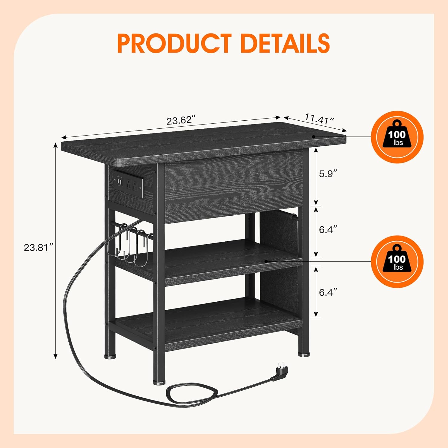 - 🛡️ 【Child-Safe Design, Worry-Free Use】Outlets positioned vertically to prevent liquid spills; rounded edges eliminate sharp corners. Sturdy metal frame supports 100 lbs per shelf