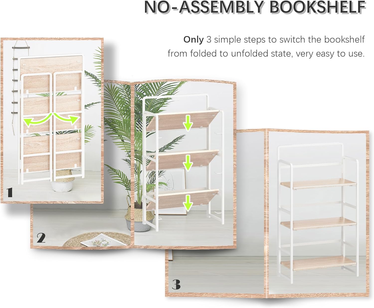 4NM No Assembly Foldable Bookshelf, 3-Shelf Collapsible Bookcase Storage for Small Spaces, 42.1" H, Natural White