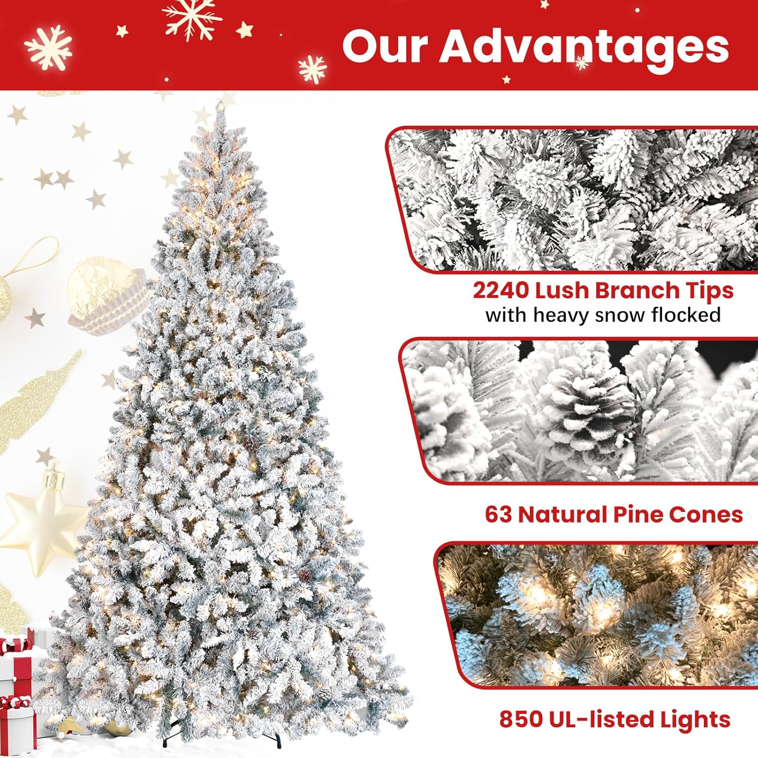 9 ft Prelit Flocked Christmas Tree with Pine Cones & 850 UL Lights, Snow Frosted Artificial Christmas Tree with Auto Hinged Stand for Holiday Decor