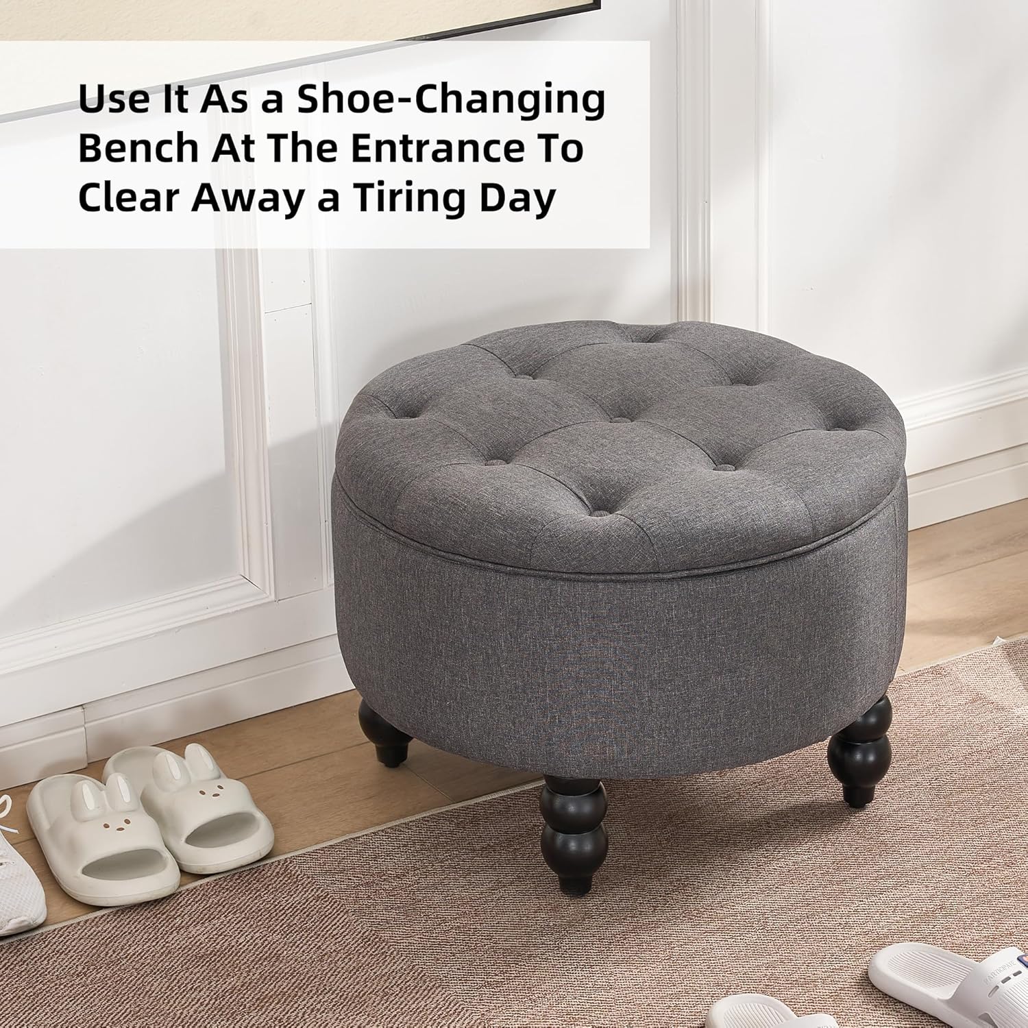Fabric Round Ottoman with Storage, Upholstered Tufted Storage Footstool, Modern Wooden Coffee Table for Living Room, Bedroom, Dark Grey