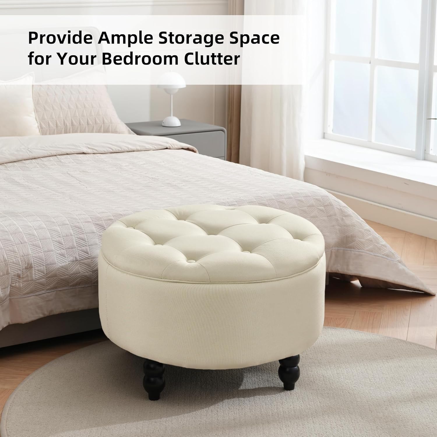 - EXQUISITE APPEARANCE: The round ottoman tufted is hand-inlaid buttons are beautiful and durable, the pure black wooden gourd-shaped legs are exquisite and unique, and the solid wood legs can bear up to 350LBS.