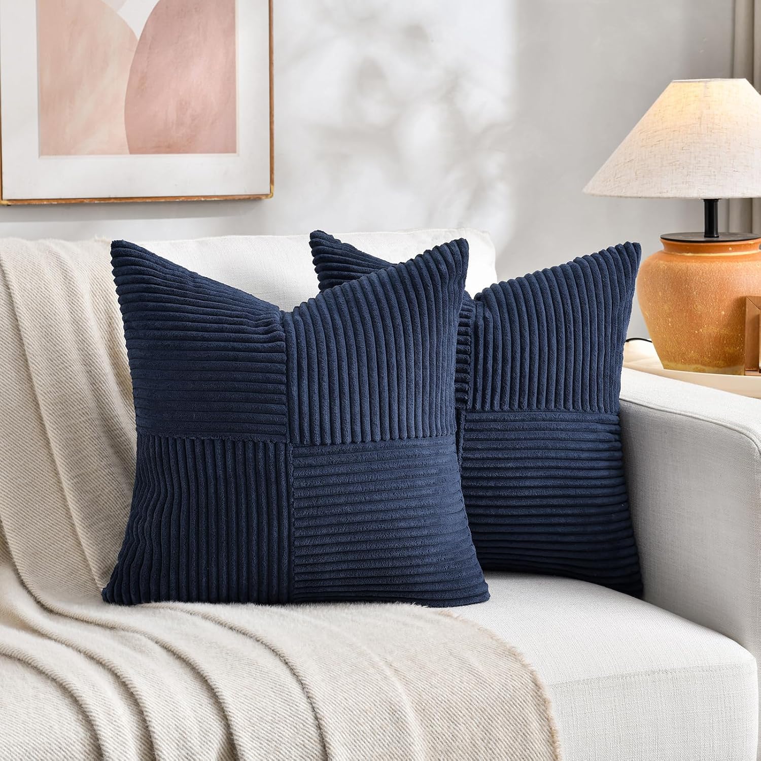 Fancy Homi 2 Packs Navy Blue Euro Decorative Throw Pillow Covers 28x28 Inch for Living Room Couch Bed, Farmhouse Boho Home Decor, Soft Corss Corduroy Patchwork Textured Square Cushion Case 71x71 cm