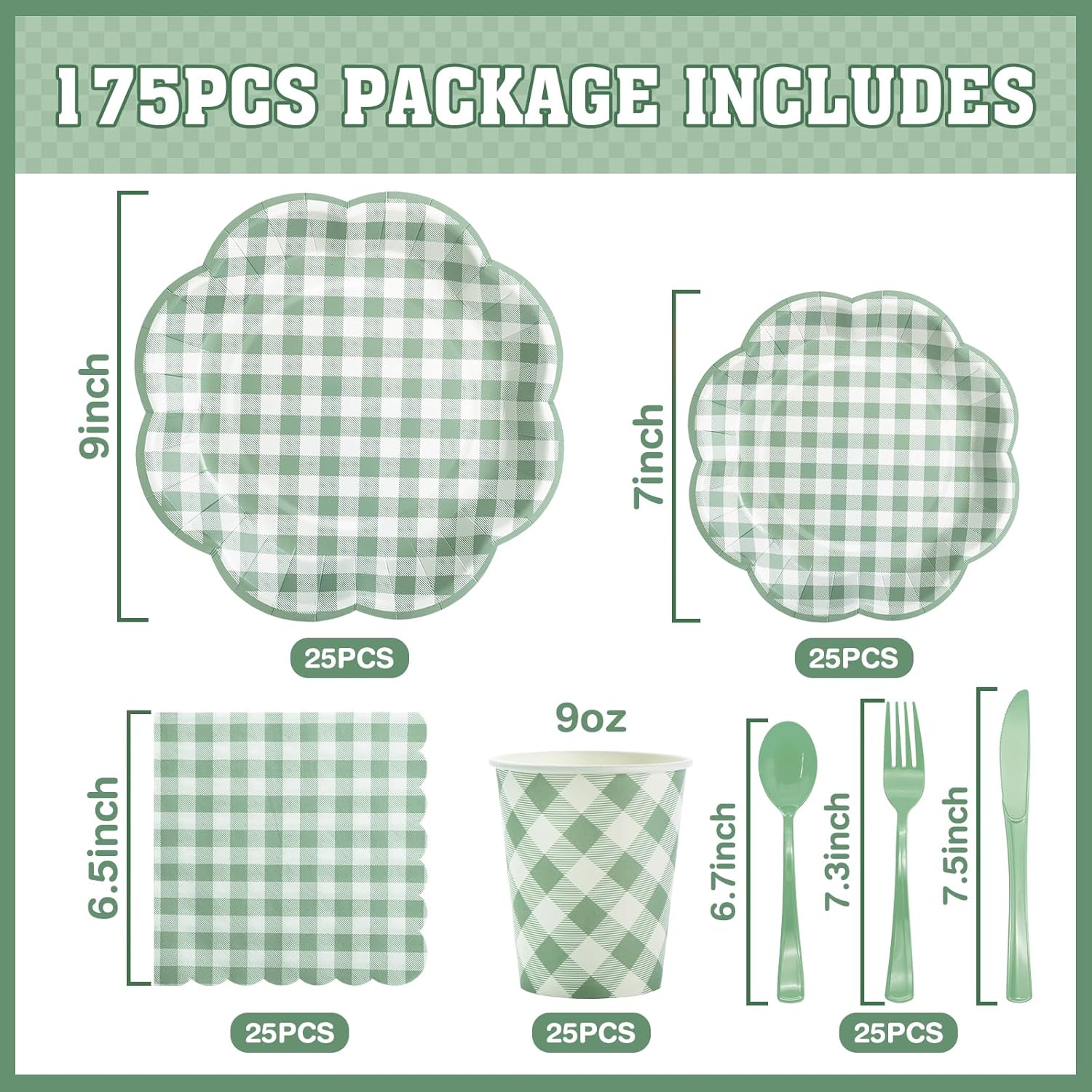 - 【Serves 25 Guests】Sage green gingham plates sets includes 25pcs 9-inch sage green checkered dinner plates, 25pcs 7-inch sage green plaid dessert plates, 25pcs 9 oz gingham cups, 25pcs 6.5-inch scalloped gingham napkins and 25 sets of knives, forks, spoons for a total of 175 pieces. Perfect for all kinds of parties and celebrations