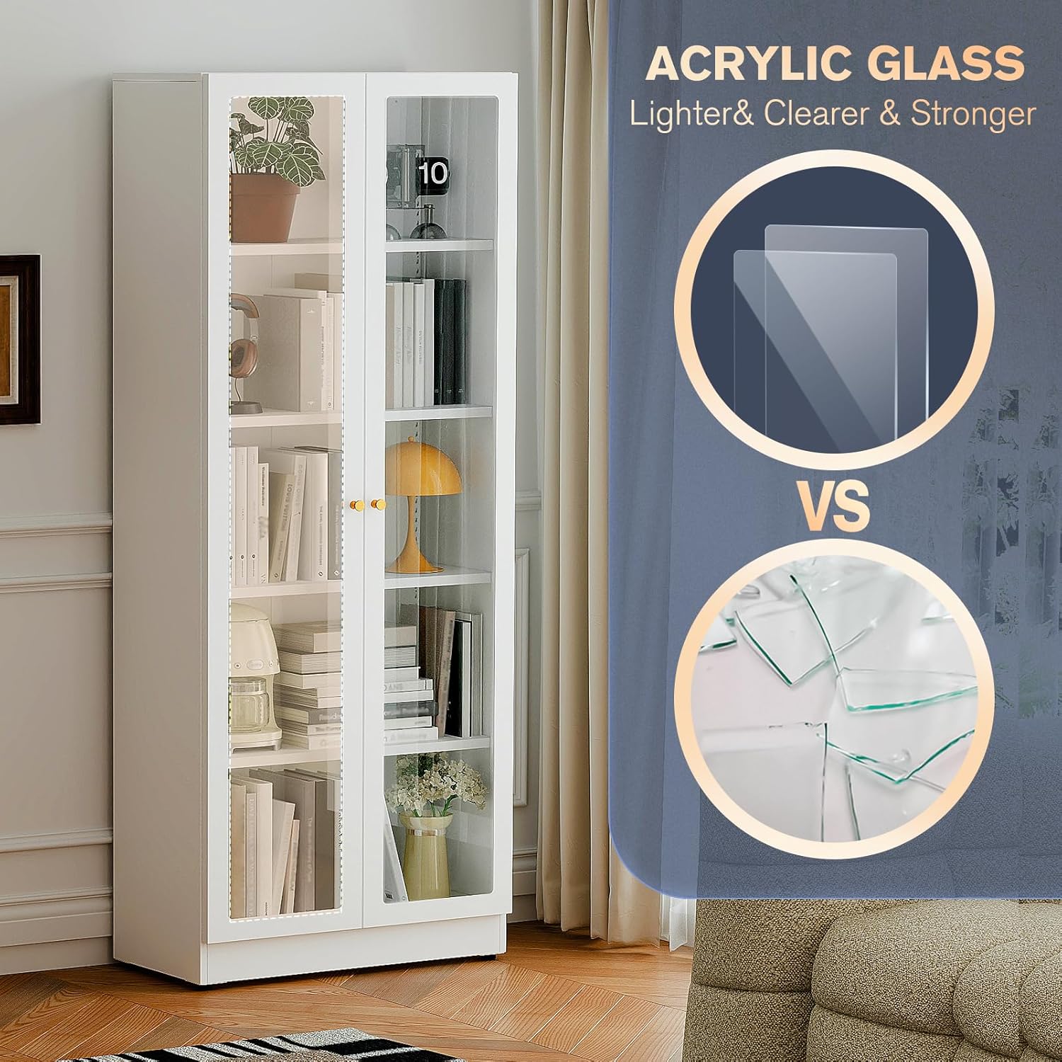 5 Tier Metal Curio Cabinets, Modern Bookshelf Cabinet with 4 Adjustable Shelves, Cabinet Display Case for Home Office, Living Room, Pantry (White-27.5W)