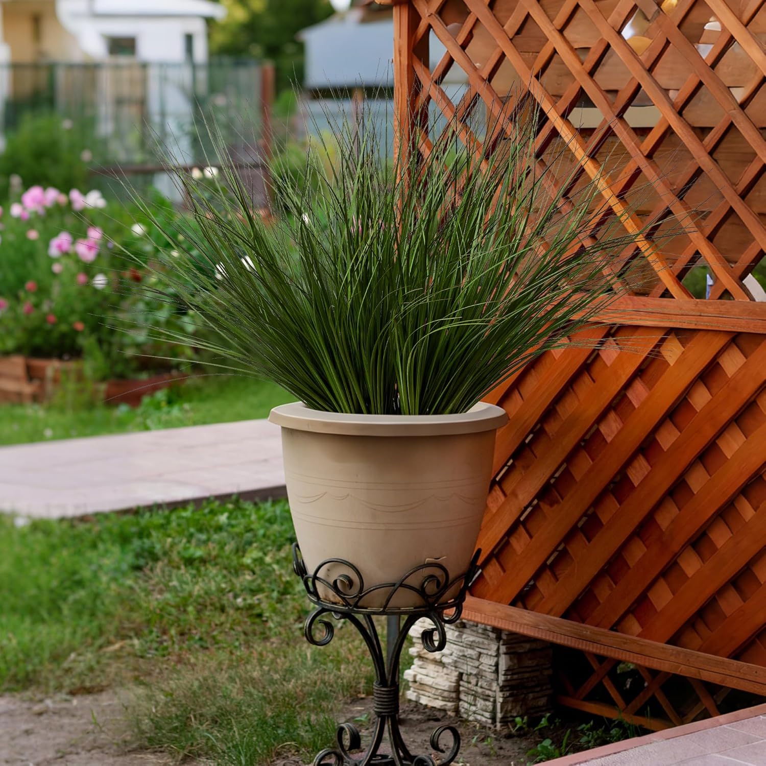 - VERSATILE DECORATION USES: The artificial wheat grass offers endless possibilities for decoration. It can be paired with other artificial plants to create a diverse greenery arrangement indoor, adding a pop of freshness to any room. For Outdoor use, it can be used to line walkways, fill flower beds, or enhance the edges of a garden. It's also a great choice for artificial grass plant projects, such as creating a miniature landscape. Its versatility makes it suitable for various home decoration.