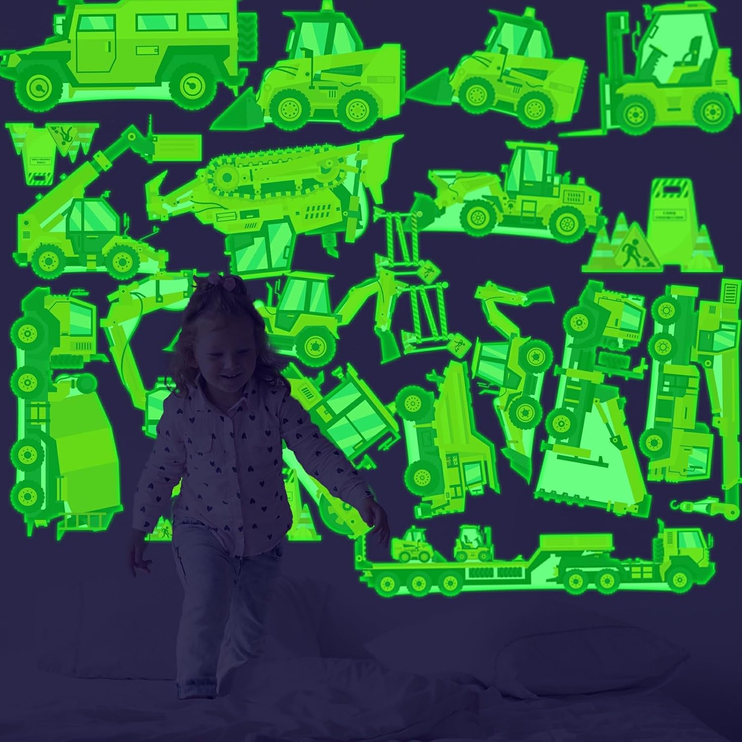Glow in The Dark Construction Stickers, 23 PCS Glowing Luminous Truck Excavator Tractor Wall Decals Vehicle Truck Ceiling Stickers for Kids Boys Girls Bedroom Nursery Playroom Party Room Decor