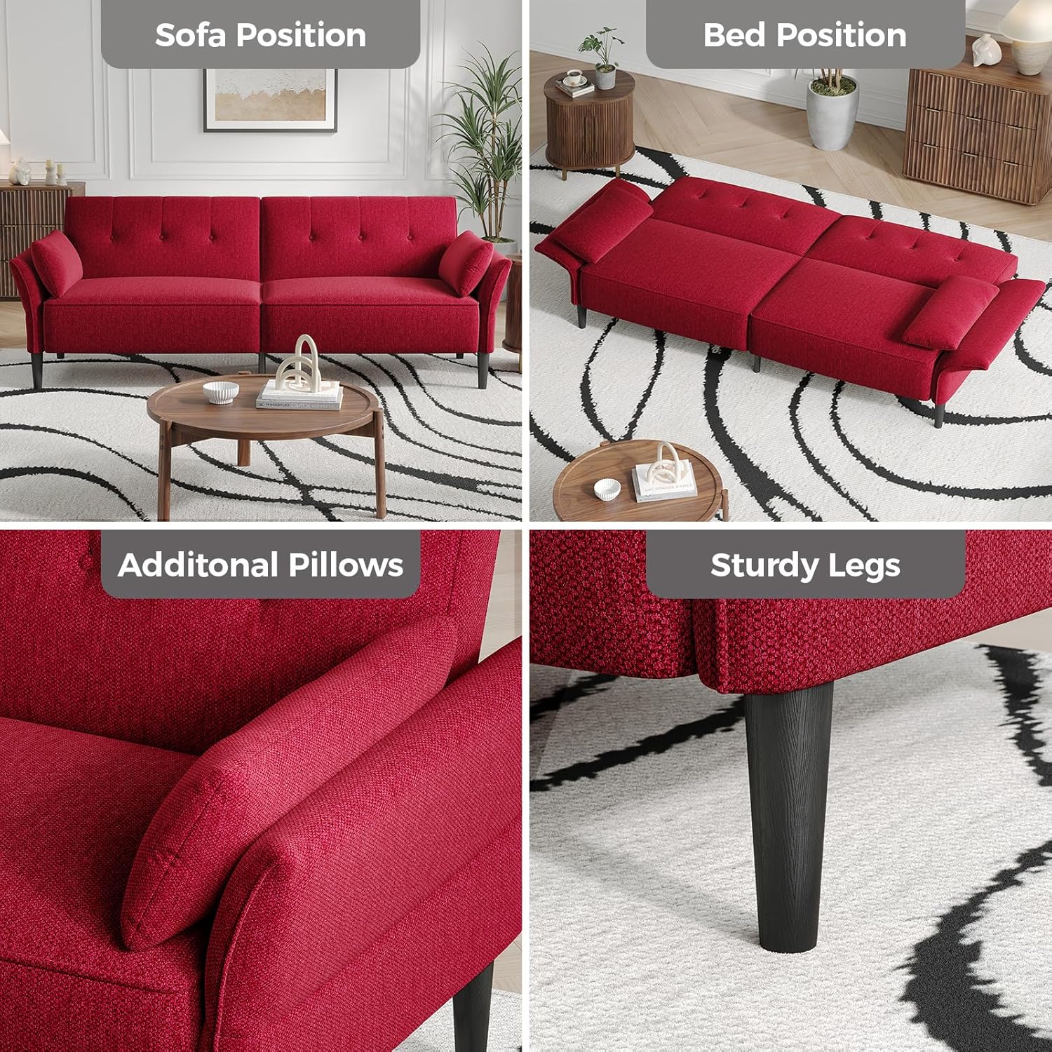89” Futon Sofa Bed, Linen Comfy Futon Couch Bed with 2 Square Pillows, Convertible Sleeper Sofa with Adjustable Backrest& Armrests, Modern Loveseat Sleeper for Living Room, Bedroom, Red