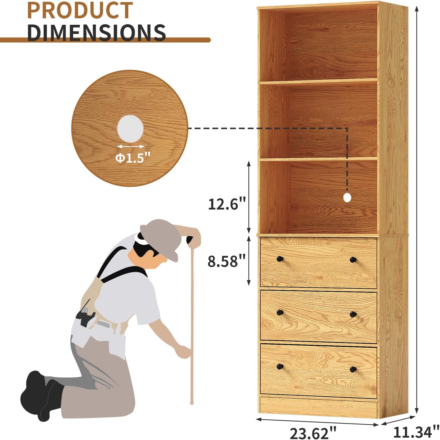 - 【Enough Storage Space】- The size of bookshelf is 23.62"×11.34"×70.87". The height of open shelves is 12.6", and the drawer is 8.58", they can meet the storage needs of daily life and is a good storage cabinet