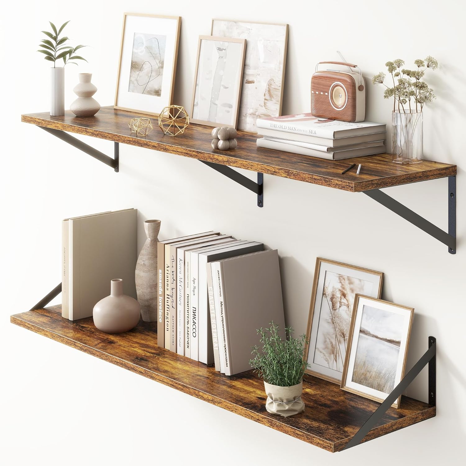 Floating Shelves 48 Inch Long, 10" Deep Floating Shelves, Wall Shelves 48 x 10, Set of 2, Wide Large Display Storage Shelves for Bathroom, Living Room, Rustic Wood Shelves with Brackets, Rustic Brown