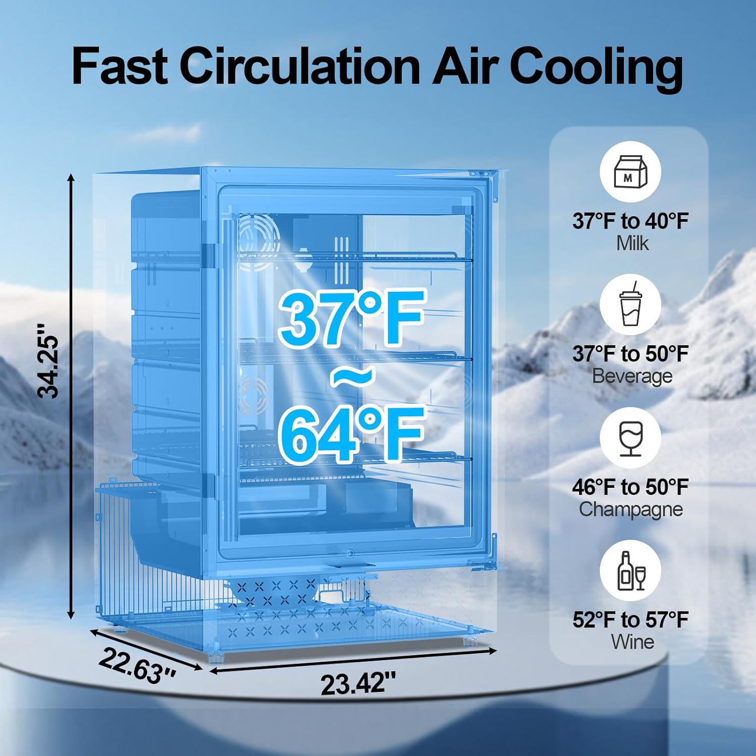 - 360° CIRCULATING AIR COOLING: Equipped with a powerful compressor cooling system and energy-efficient technology, this beverage cooler delivers strong, fast, and stable cooling performance, with a temperature range of 37° F - 64° F (1 - 16° C). It keeps your beverage at a constant temperature while quickly and reliably cooling your drinks. Additionally, it minimizes vibrations and noise, with an operational noise as low as 40 decibels.