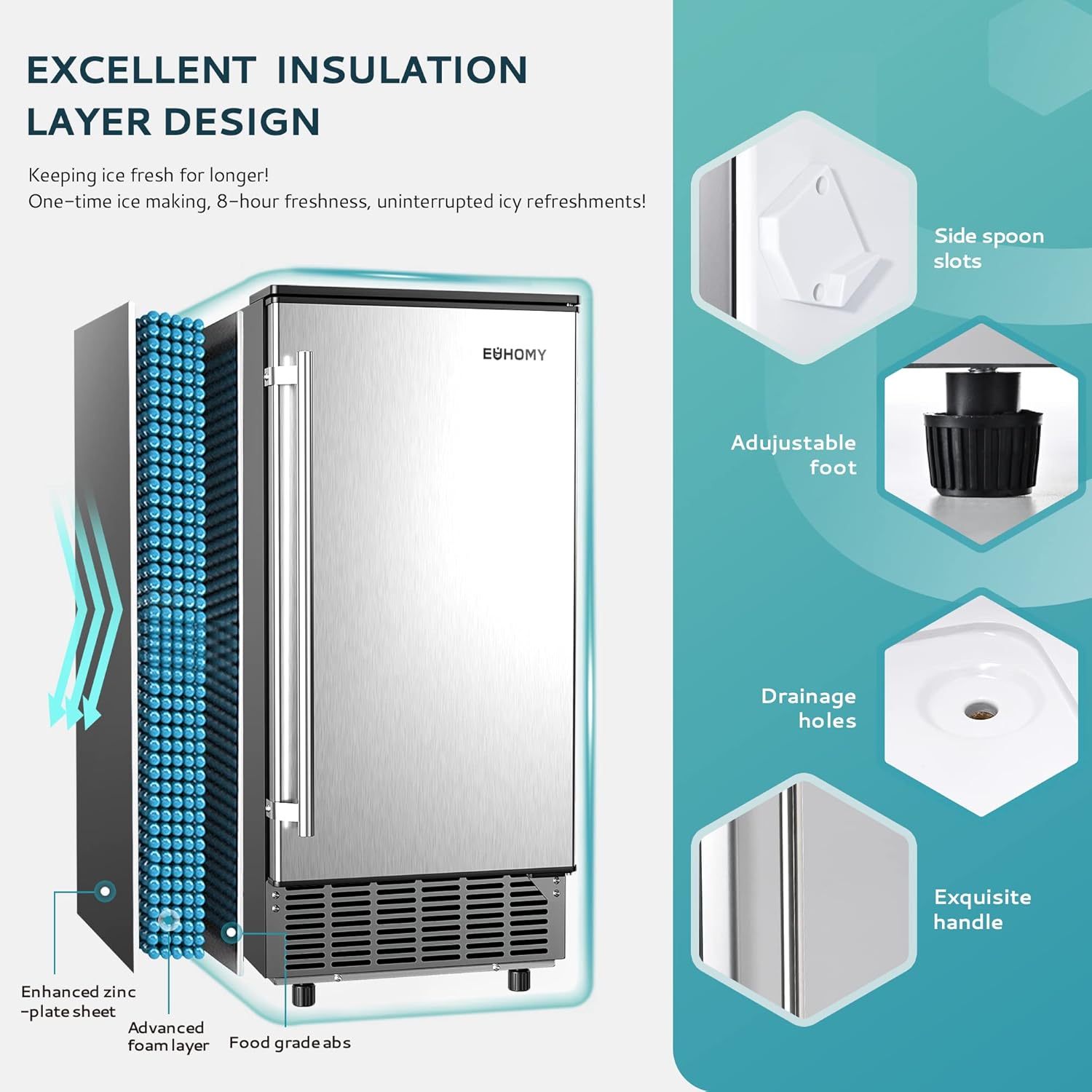 EUHOMY 15" W Commercial Under Counter Ice Maker Machine, 90 Lb/Day Auto-Cleaning & 24H Timer, Gravity Drainage,Stainless Steel Built-in Freestanding Ice Maker, 24 Lb Bin, Ideal for Commercial & Home