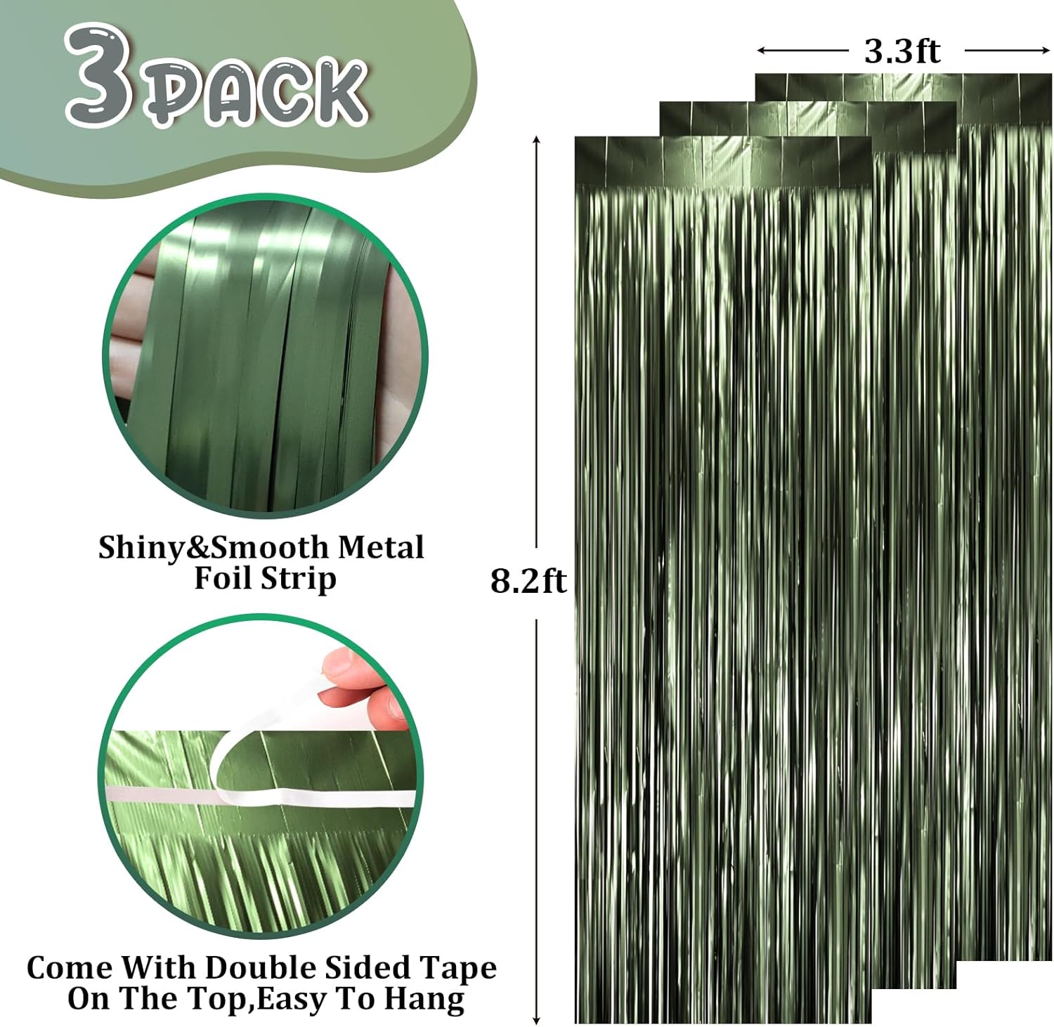 - Package Included: 3 packs of green foil fringe curtains, the size of the foil curtain is 3.3*8.2ft. It's long enough to fit any occasion