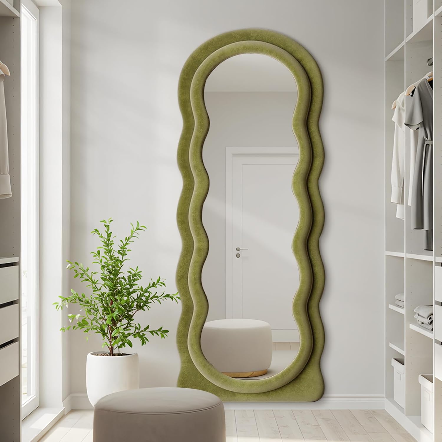 - Green Flannel Irregular Wavy Frame Floor Mirror: The full length standing mirror features a modern style that can complement any type of room decor, adding a touch of elegance to your room. It will be a great wall decor art piece for your home. This full body mirror with sleek looking is also great for selfies or pictures in general