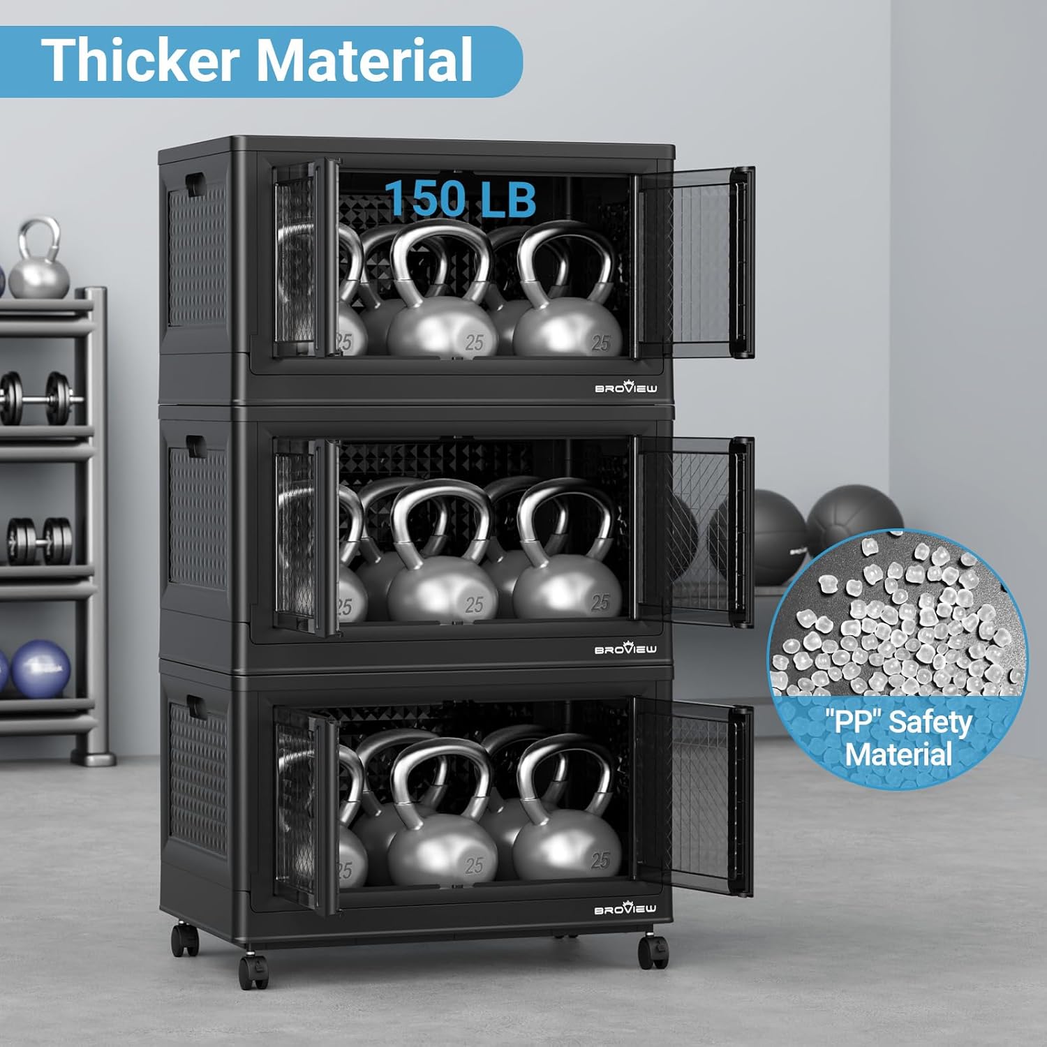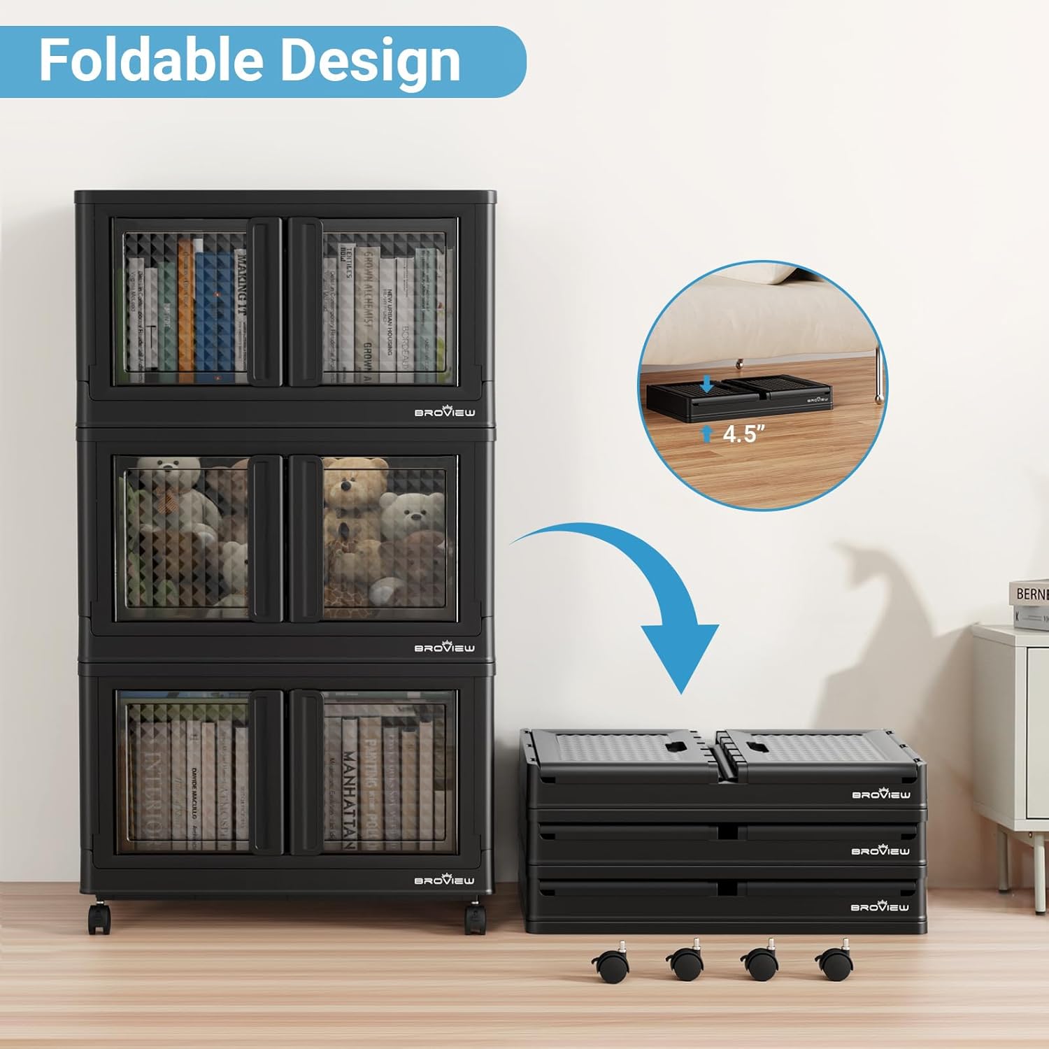 600Qt Stackable Storage Bins with Lids, 150Gal Closet Organizers and Storage Drawer, Plastic Collapsible Storage Bins with Doors, Heavy Duty Store Box Cabinet for Home Kitchen, 6Pack Black