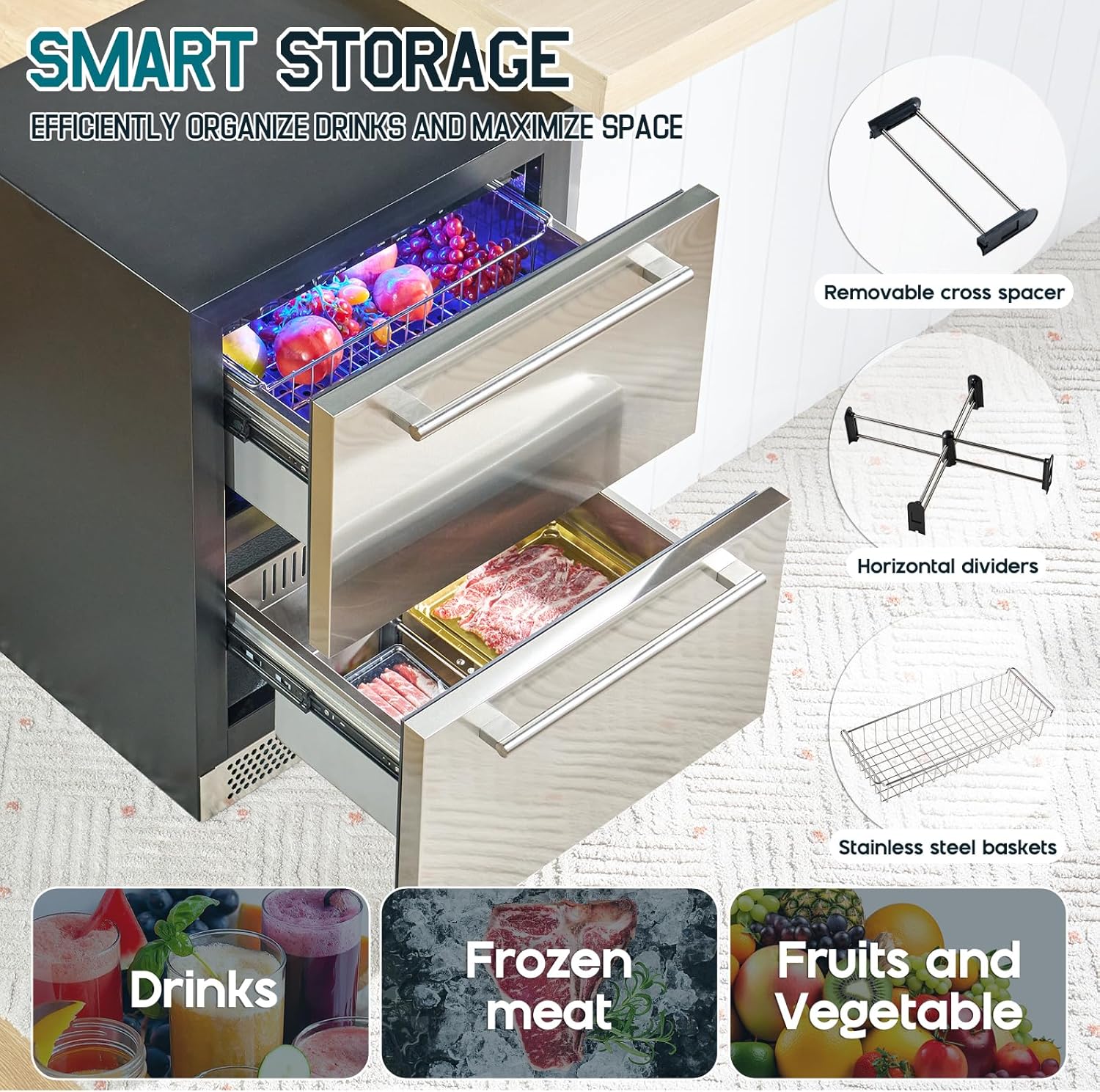 Albott 24 Inch Under Counter Drawer Fridge – Stainless Steel Dual-Zone Beverage Refrigerator with LED Touch Control, Adjustable Storage, Frost-Free, Low Noise, 37℉-50℉, -0.4℉ to 37℉