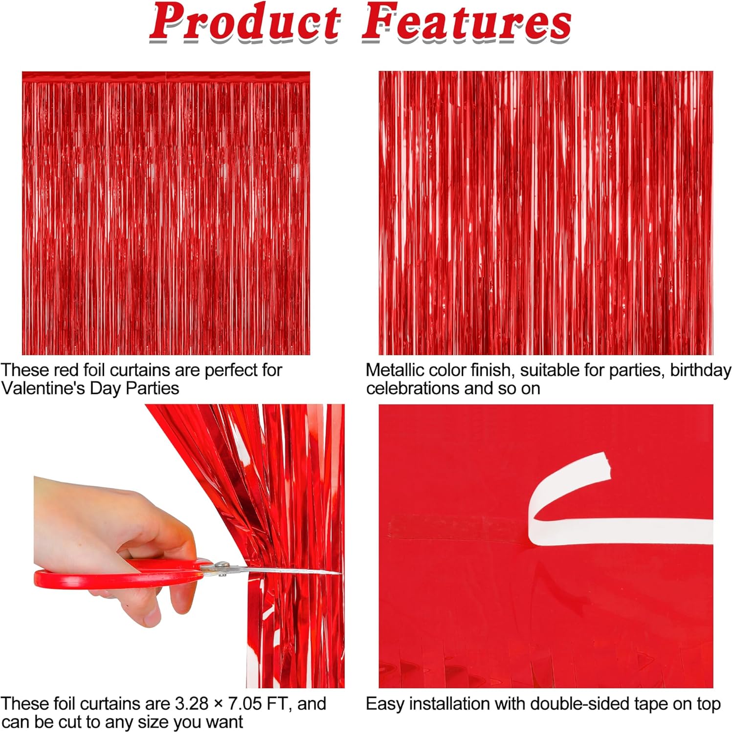 - Package Contents: The package includes 8 pcs red tinsel backdrop, each with dimensions of 3.28 FT x 7.05 FT. These Valentines tinsel curtains can be trimmed to fit any specific area.