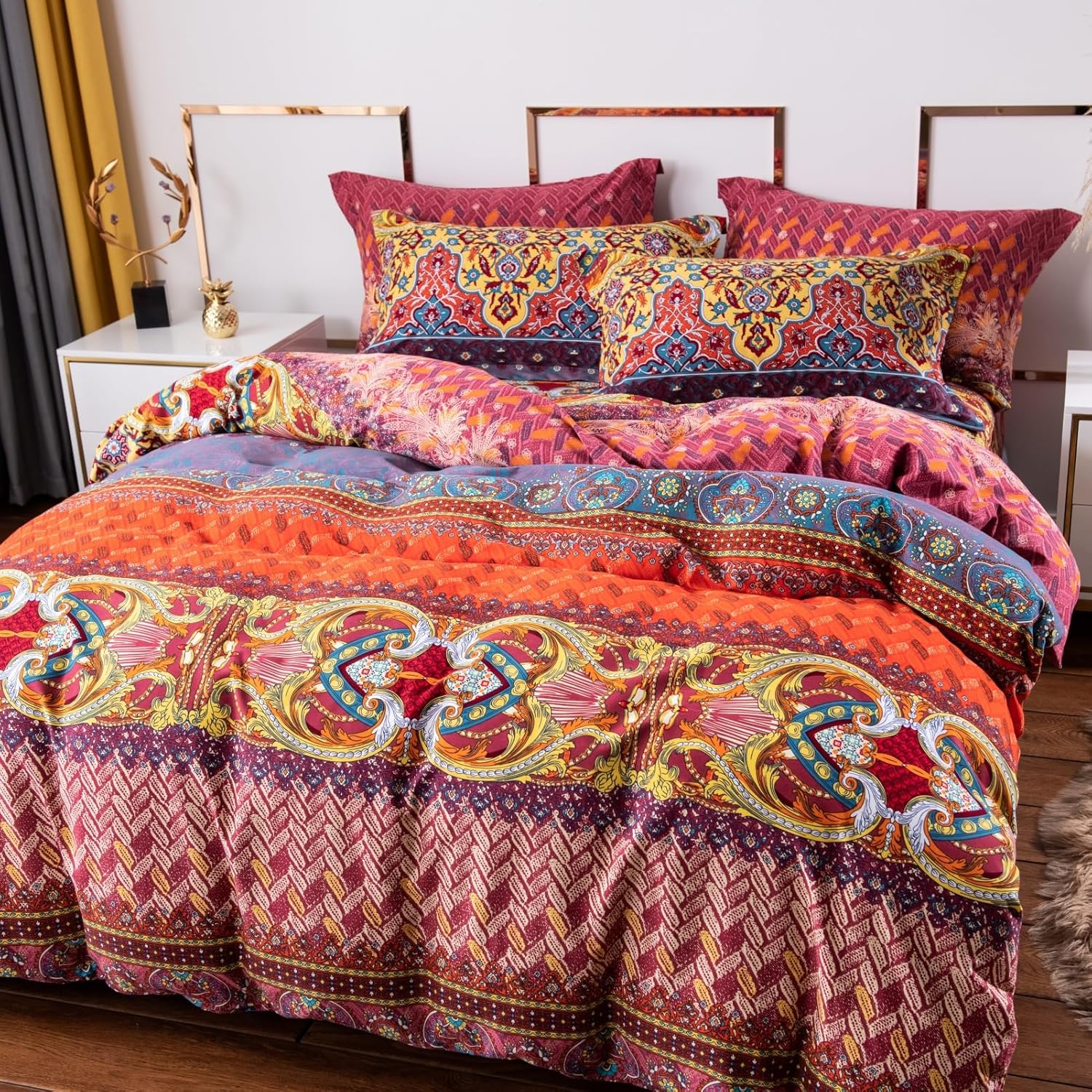 ABREEZE Bohemian Duvet Cover Set Colorful Orange Boho Retro Bedding Set Damask Paisley Cotton Duvet Cover Tribal Reversible Bedding Exotic Style Comforter Cover 3-Piece Cal.King