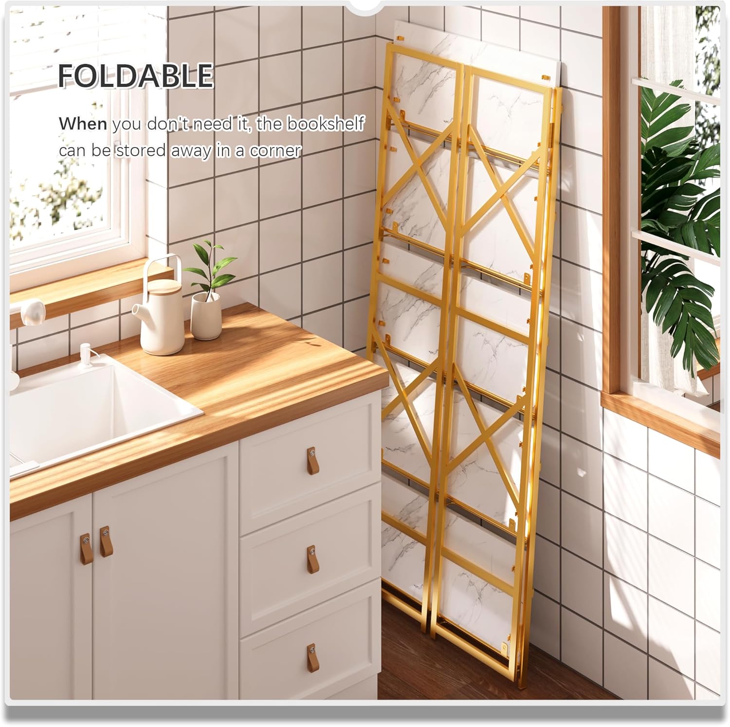 4NM 5 Tiers No Assembly Book Shelves, 51.2" H Folding Bookshelf Bookcase Open Industrial Foldable Shelves for Bedroom, Living Room, Home Office - White Gold