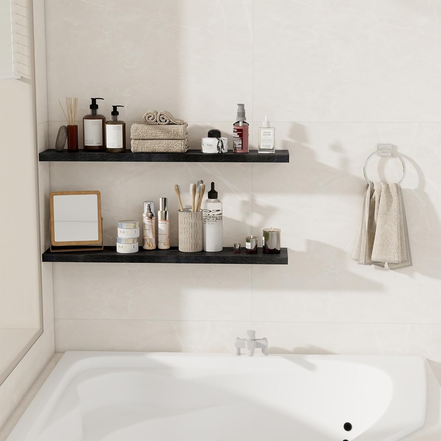 - STYLE & VERSATILITY: Elevate your home with our set of 2 elegant wall shelves, designed for versatile display options. Arrange them side by side for a clean, unified look, or stagger them for a bold, dynamic effect. Adding a touch of sophistication while providing practical storage
