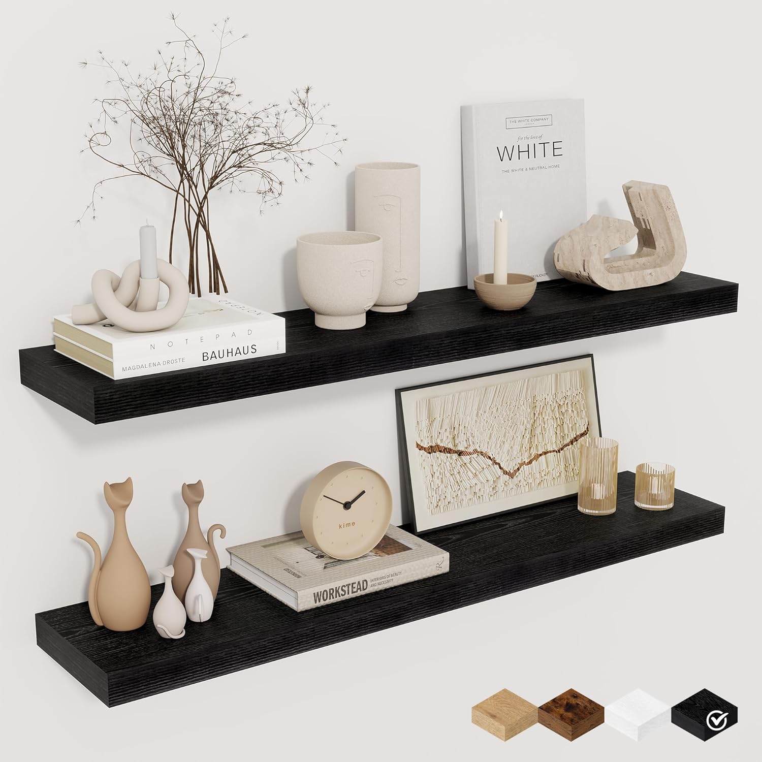 - STYLE & VERSATILITY: Elevate your home with our set of 2 elegant wall shelves, designed for versatile display options. Arrange them side by side for a clean, unified look, or stagger them for a bold, dynamic effect. Adding a touch of sophistication while providing practical storage