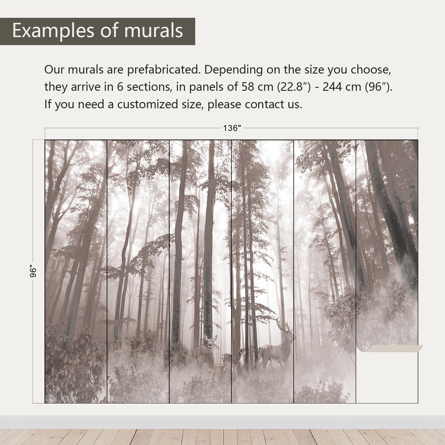 - Size note: Mural measures 136"W x 96"H and is divided into 6 sections, each section is labeled with a number underneath, eliminating the need to overlap patterns when installing.