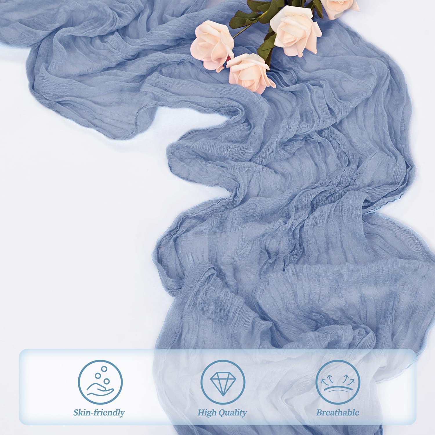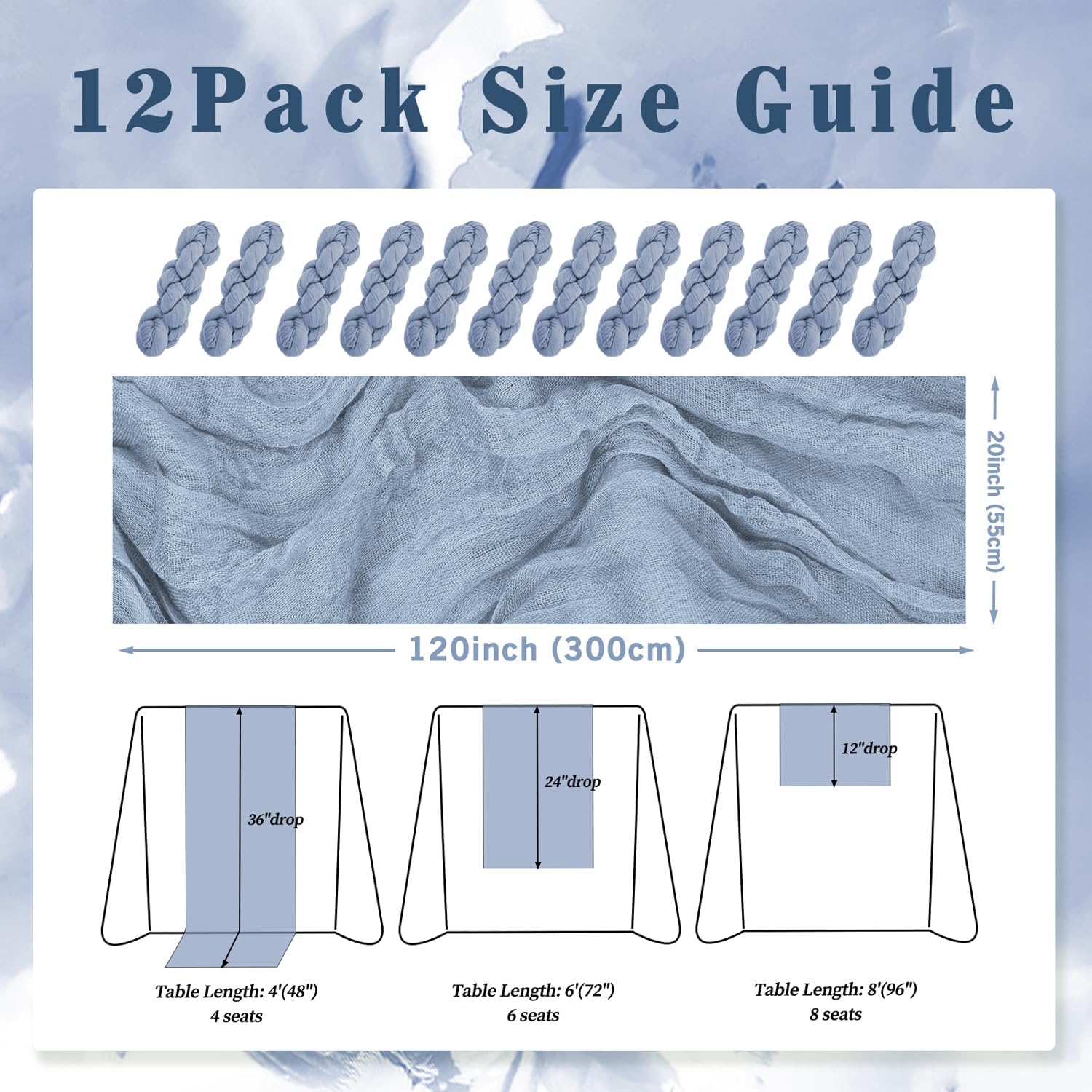 - Cheesecloth Table Runner Size: You will receive 12 dusty blue cheesecloth tablerunner, each measuring 20 x 120 inches. The quantity is sufficient for you to decorate various romantic occasions. It can decorate most shaped tables, such as rectangular tables, round tables, and cocktail tables. It is long enough to decorate a large table and be placed perfectly and elegantly on the tabletop, adding a romantic atmosphere to your occasion.