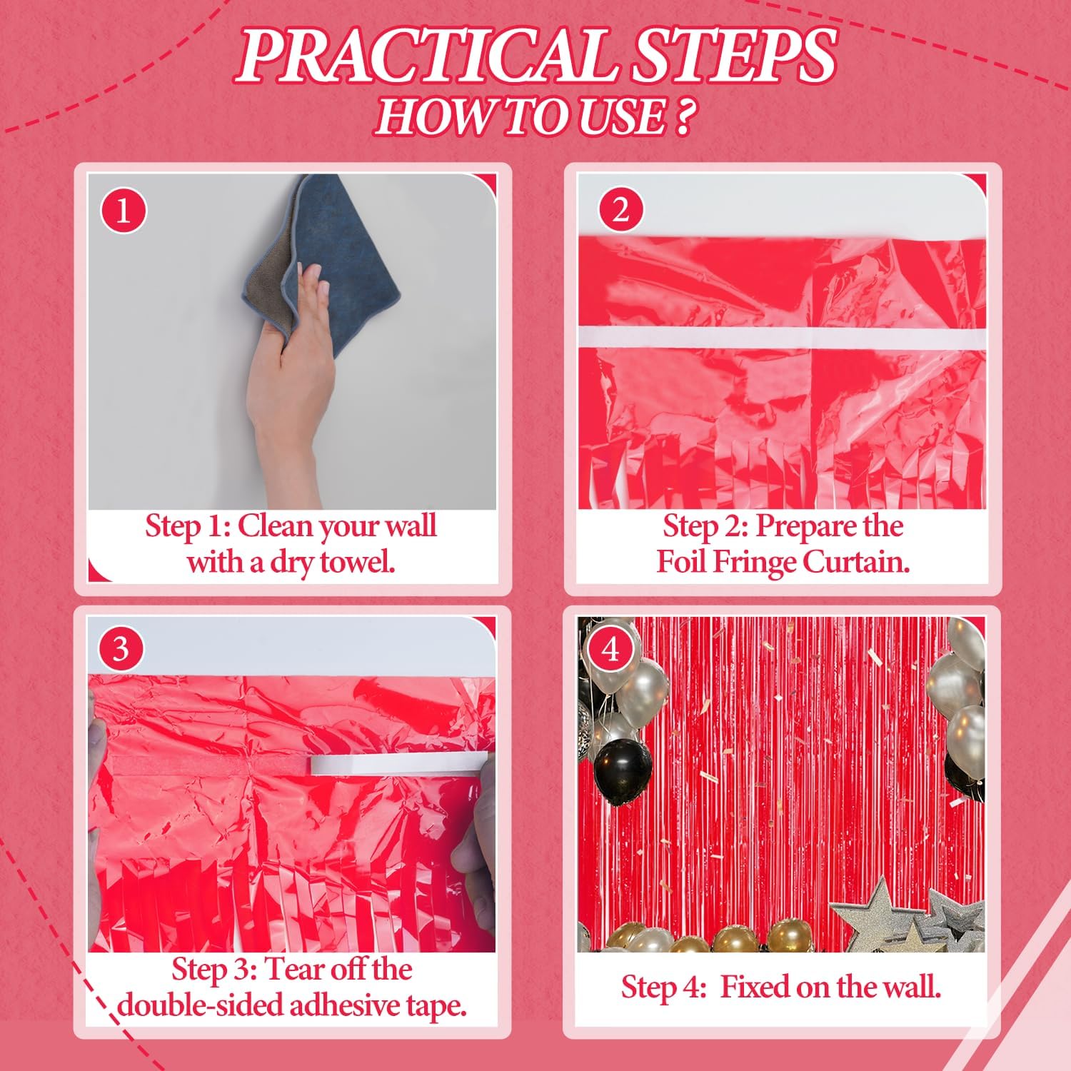 - ăEasy and Convenient InstallationăThese foil fringe curtains are easy to install and can be quickly hung on smooth surfaces using the included double-sided adhesive tape. No extra tools or materials required.