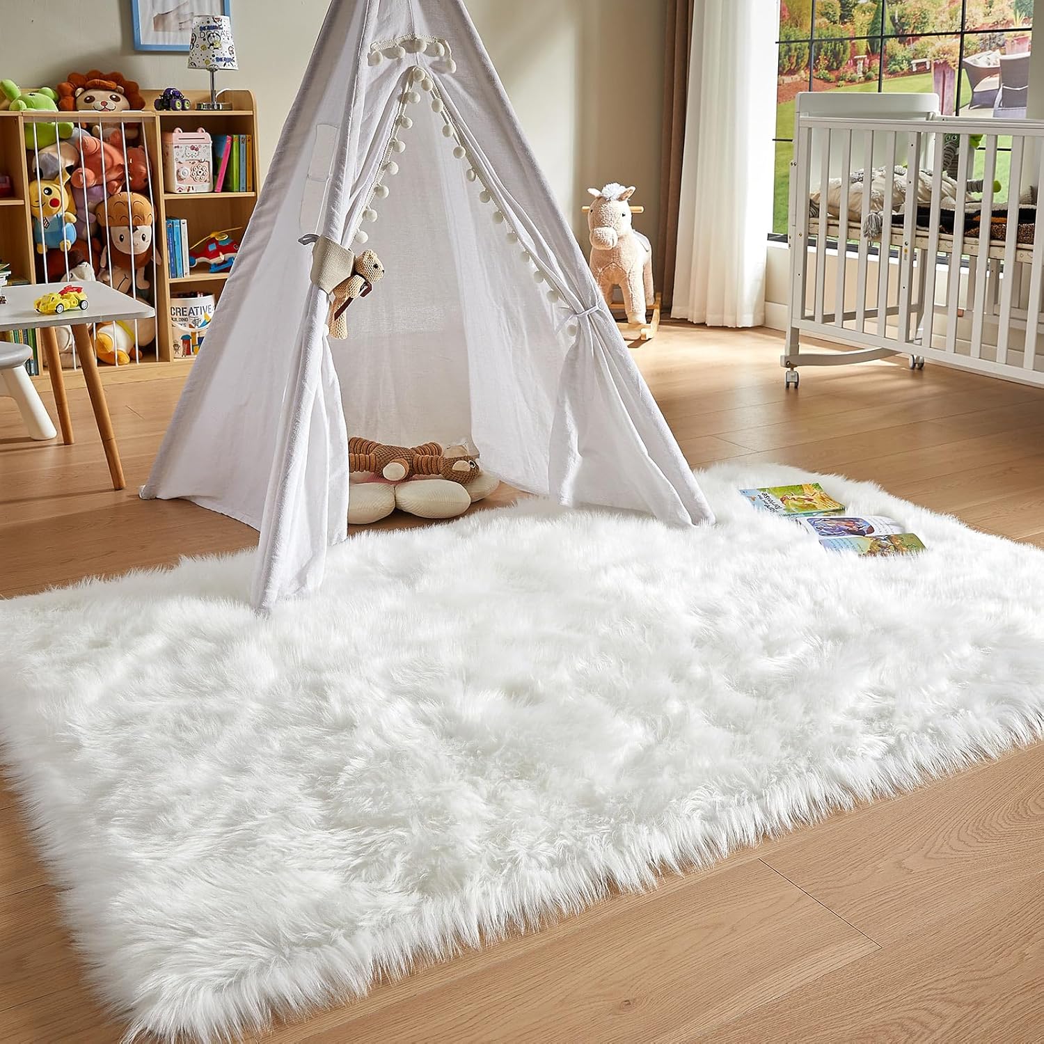 AMTOVO Faux Fur Sheepskin Rug for Living Room, 4 x 6 ft White Fluffy Area Rug for Bedroom, Playroom, Luxury Room Decor, Rectangle