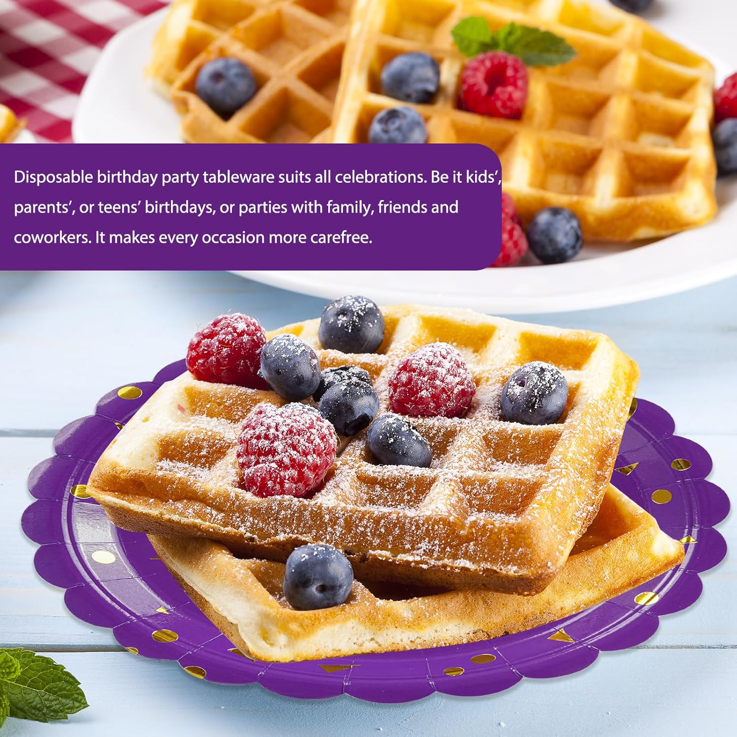 - 【PURPLE BIRTHDAY DECORATIONS】: Purple birthday party plates set comes with 50pcs purple paper plates, serve up to 50 guests, specifically for dessert plates size: 18cm/7inch, small but definitely sturdy enough to serve dessert, cake, appetizers and other party foods, gold foil paper plates are exquisite and generous, it's a must-have finishing touch to your birthday dinner!
