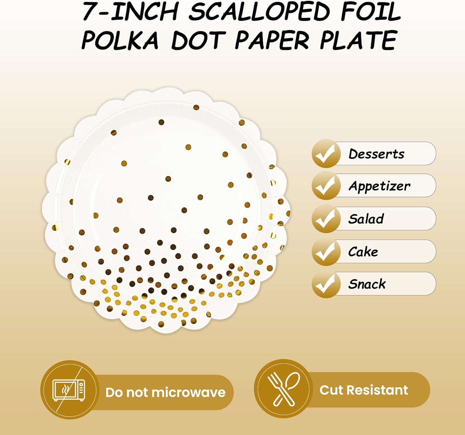 - 【SUPERIOR QUALITY】: Made from thick and food grade 350gsm heavy duty paper, environmentally friendly, odorless, heat resistant, these disposable white plates are strong enough to hold a variety of snacks, salads, and desserts without sagging or tearing. The surface is made of a waterproof membrane, so that your white and gold cake plates can be used with more peace of mind.