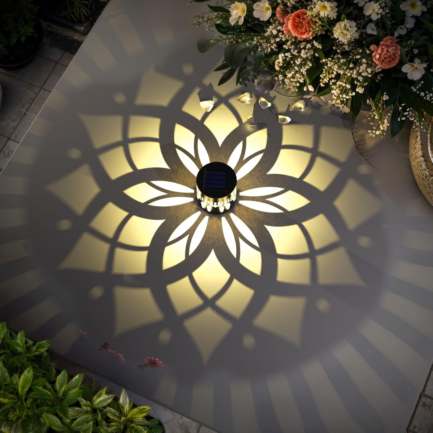 - Good Decoration: 10 lumens of warm yellow light. The small fence solar lights can project a unique and beautiful mandala pattern. In a dim environment, the solar lights can illuminate a corner of the fence or the wall and create a beautiful and warm atmosphere. They are very suitable as holiday decorations and gifts for relatives and friends.