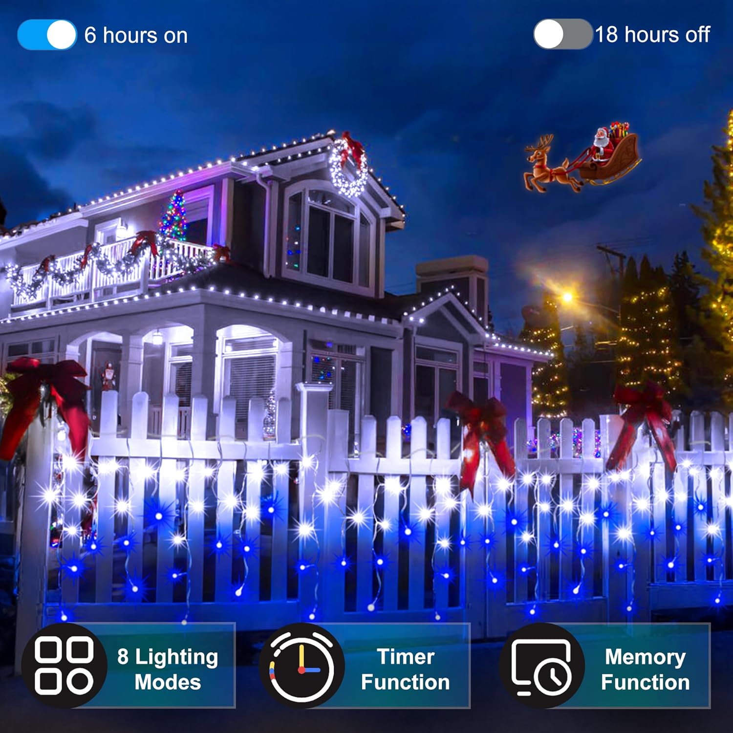 - Dual-Tone Cool White & Blue Icicle Lights: Create a captivating winter wonderland with this 66ft LED icicle string lights featuring cool white and blue LEDs. With 666 energy-efficient bulbs and 148 drops, these lights produce a stunning frosty aqua glow that mimics glacial elegance. Perfect for outlining rooflines, windows, fences, and trees, this dual-color combination creates a magical frozen effect ideal for both residential and commercial holiday decorating