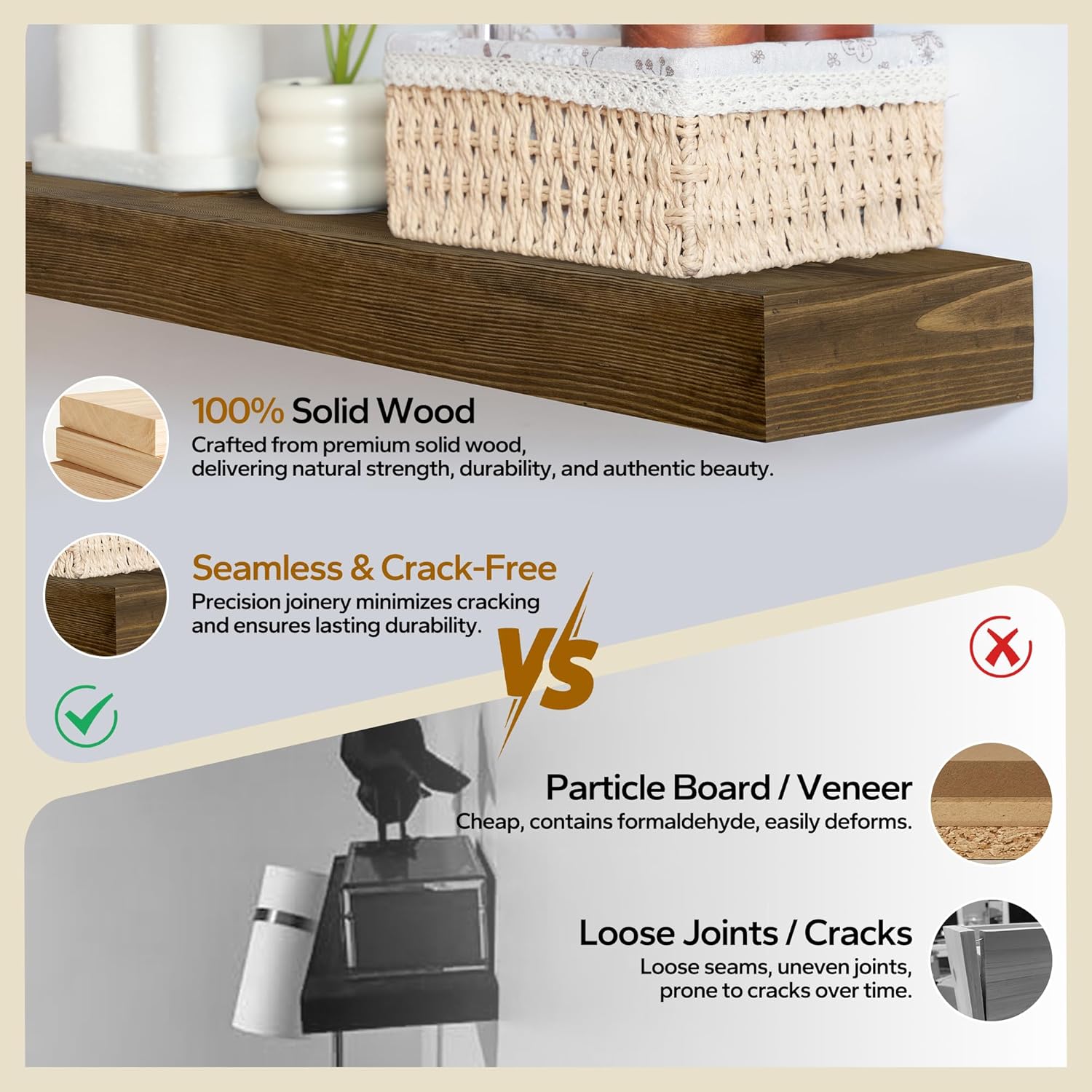 - Premium Handcrafted Solid Wood Shelves:Our floating shelves are made from 100% solid pine wood, handcrafted to showcase the natural grain and unique knots of the wood. With dimensions of 24 inches long, 8 inches deep, and 3 inches thick, the rustic stain adds timeless charm. Each shelf can support up to 35 pounds per stud (2 studs = 70 pounds), ensuring durability and strength.
